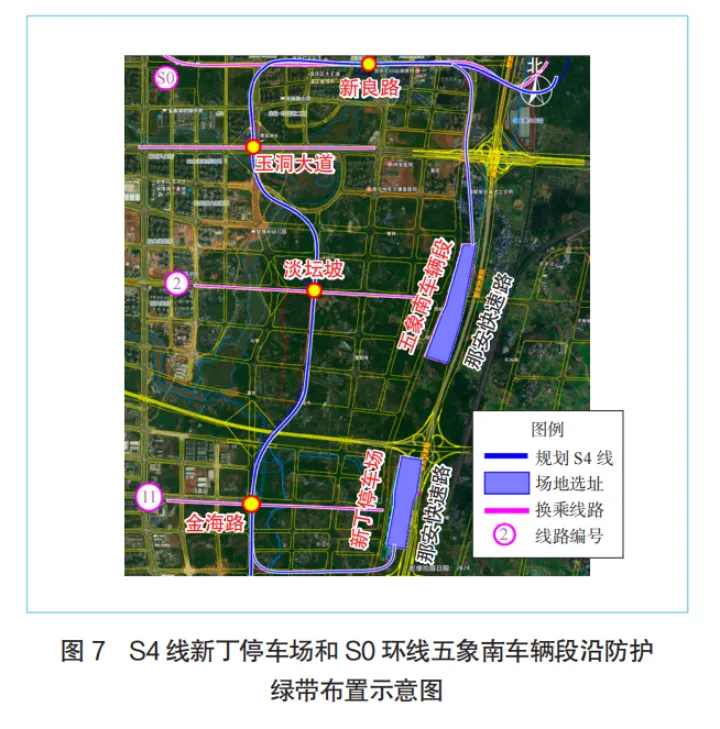 (3)建议将部分车辆段/停车场选址调整至城镇开发边界外,利用快速路和高速路沿线防护绿带进行布置。当前,中心城区土地资源紧张,而车辆段/停车场占地面积大、影响范围广。考虑到城镇开发边界外允许布局交通基础设施及其他线性工程,建议将S4线的大塘车辆段和新丁停车场,以及S0环线的五象南车辆段选址调整至那安快速路(兰海高速)旁的防护绿带内,如图7所示,以减少对建设用地的占用。