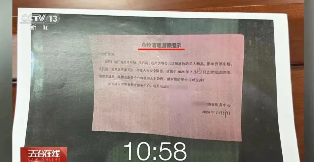 2024年7月,南宁某小区物业工作人员邱先生在巡查时,发现地下停车场堆放着大量个人物品,调取监控均未查明堆放时间及物主后,物业在物品和墙壁上张贴了清理提示。