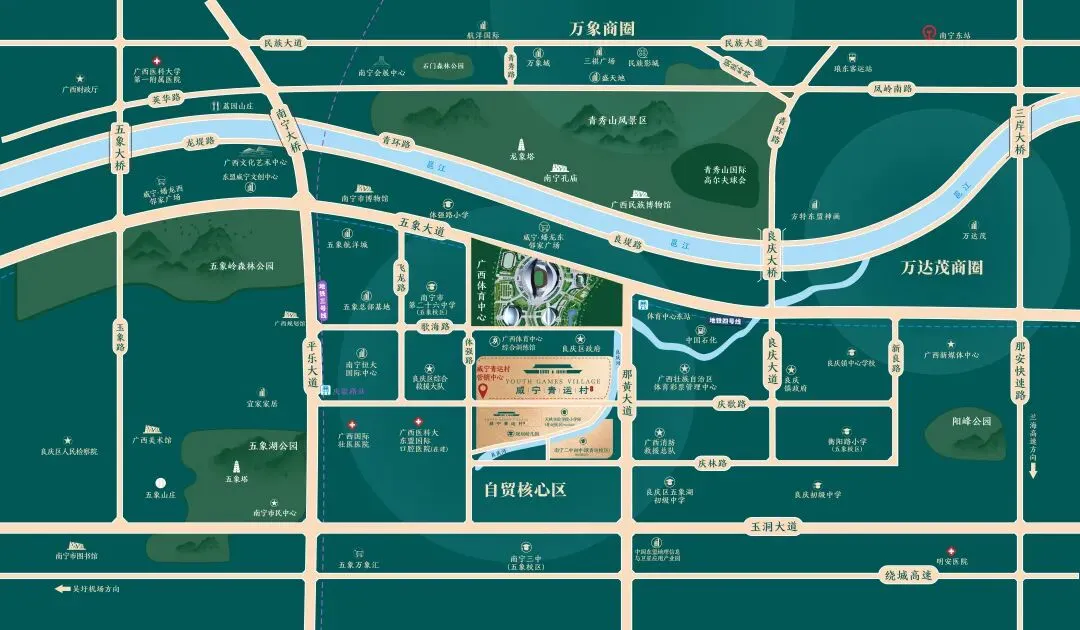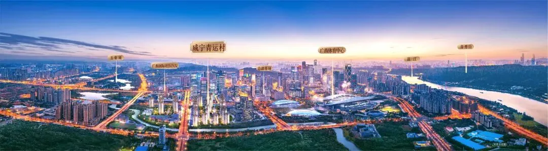 良庆河环绕,临近五象湖,对望邕江与青秀山,实现百米见河,千米瞰湖,二千米望江与山的多重观景体验。