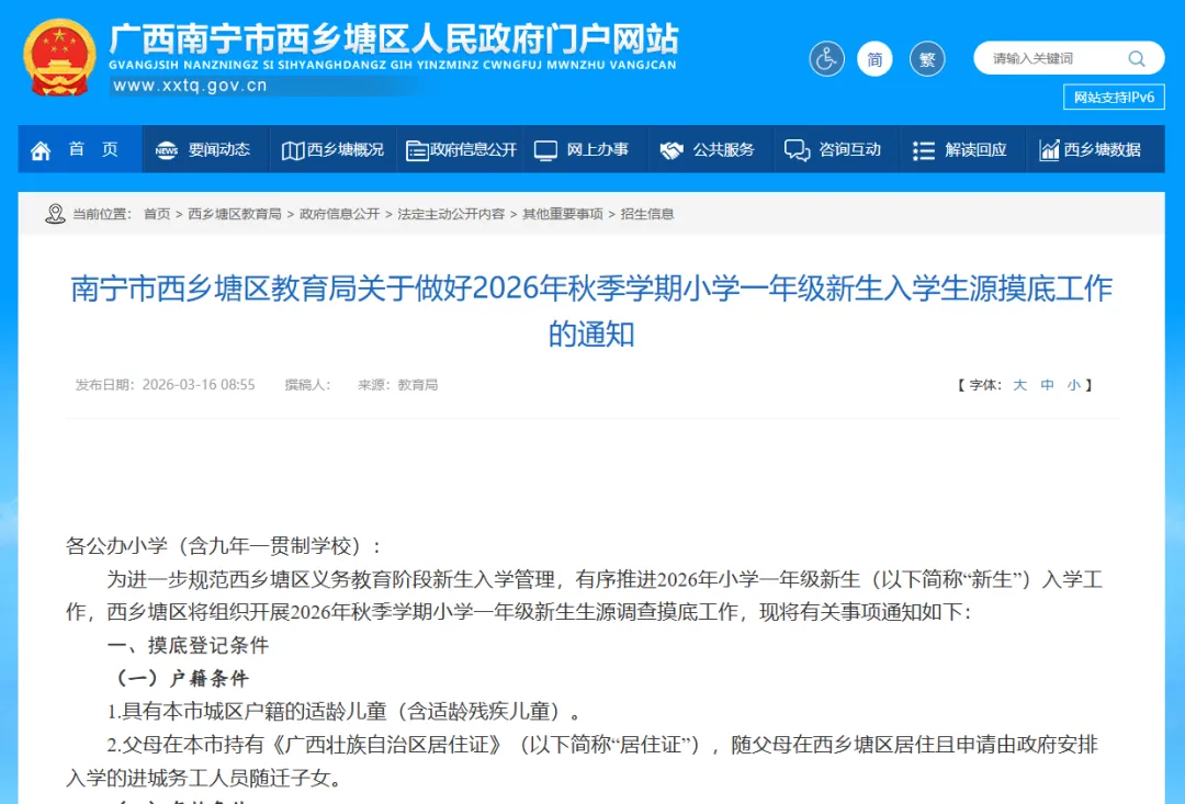 西乡塘官方链接:南宁市西乡塘区教育局关于做好2026年秋季学期小学一年级新生入学生源摸底工作的通知