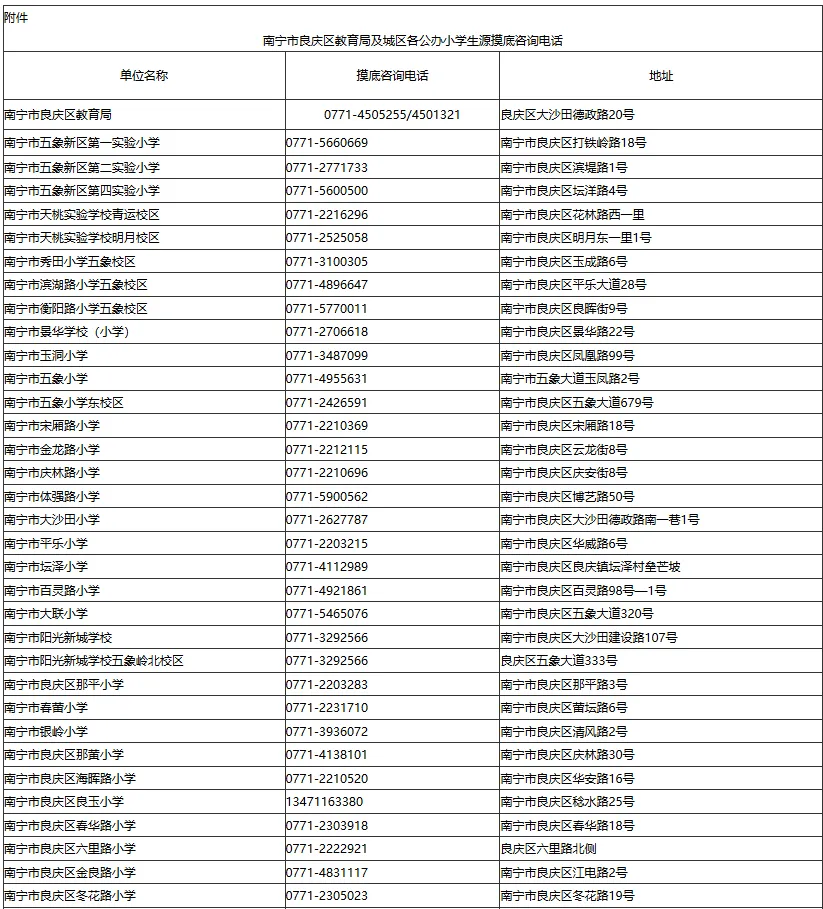 (二)良庆区教育局委托辖区内各有关学校、社区居委会(村委)负责宣传指导家长填报本年度适龄儿童摸底调查,请新生家长予以配合。如有疑问,可咨询良庆区教育局或相关学校,咨询电话详见附件。