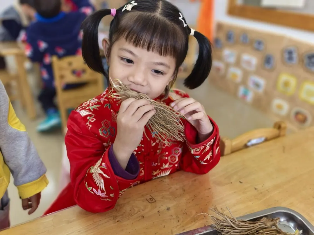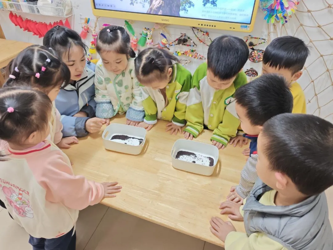 随后,老师带领孩子们走进“奇妙种子大探索”环节,各式各样的蔬菜种子让孩子们充满好奇。大家围在一起,看一看种子的形状与色彩,摸一摸种子光滑或粗糙的质感,闻一闻种子淡淡的清香,用感官探索生命的初始模样,小小的眼睛里满是对种子发芽、生长的期待。