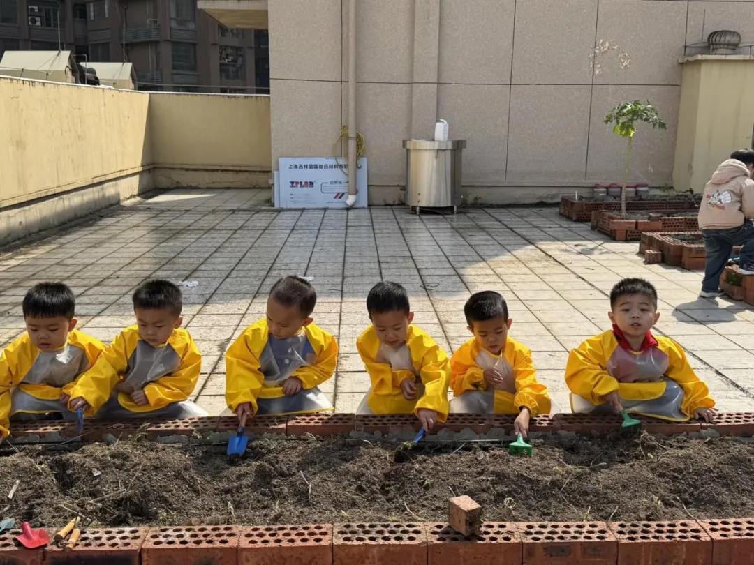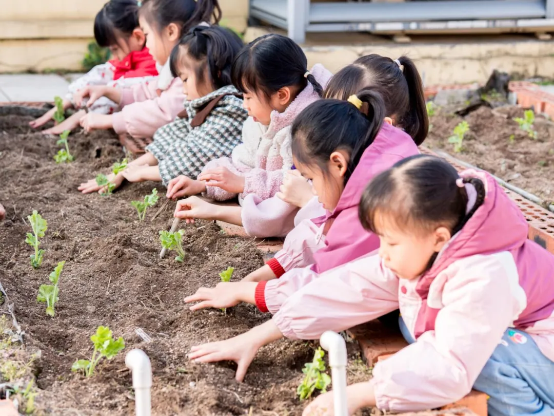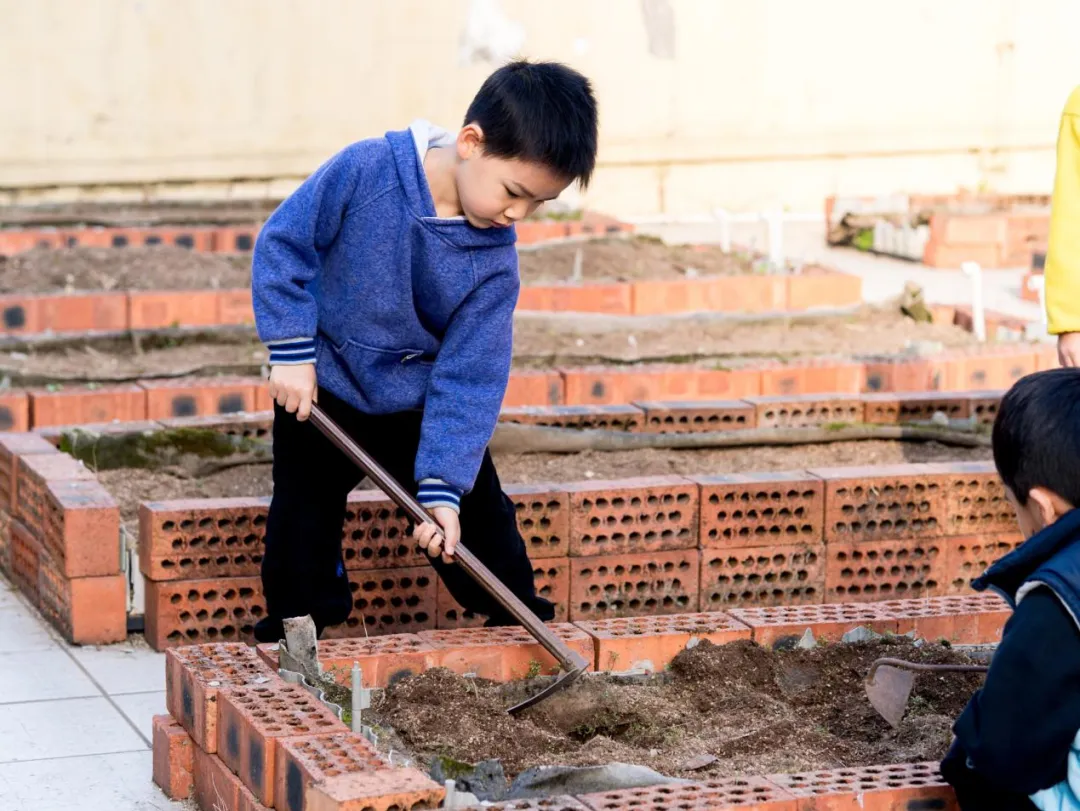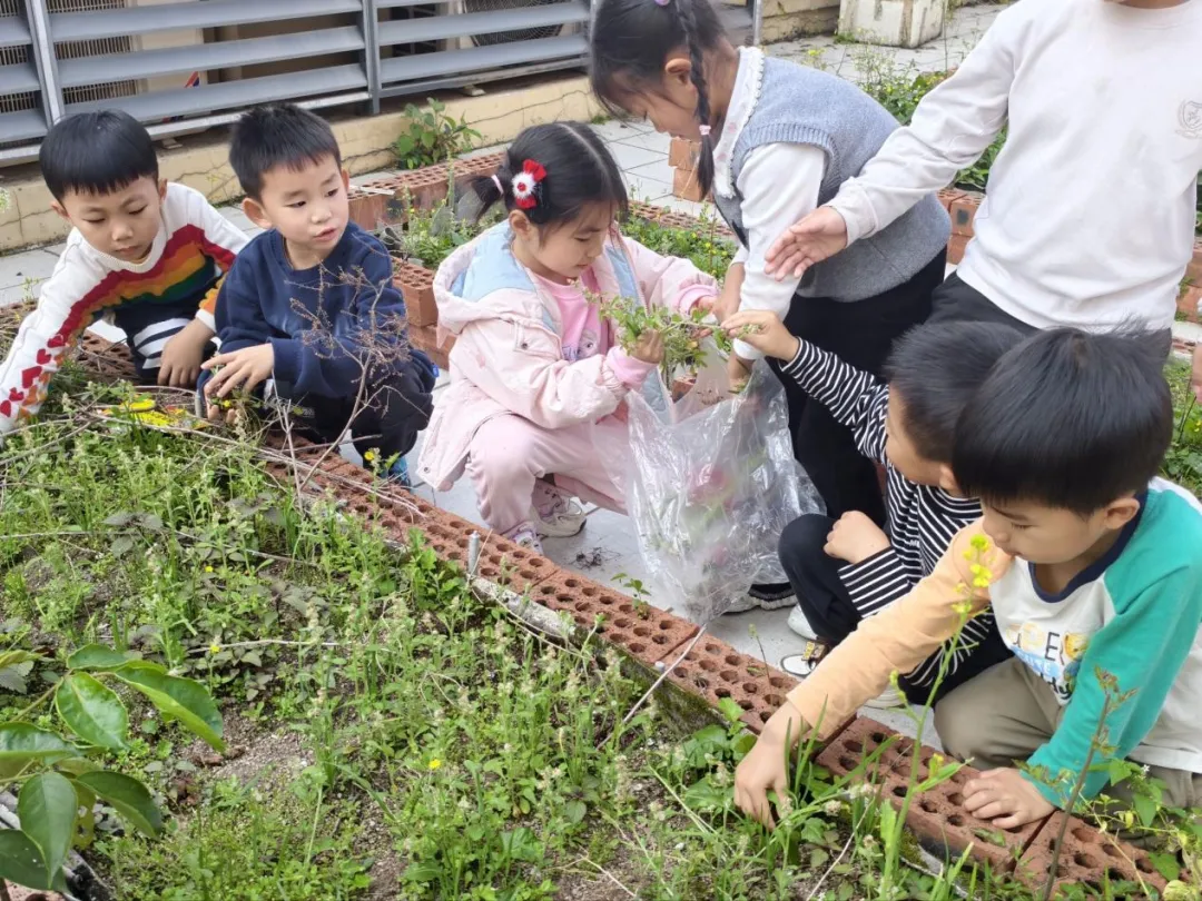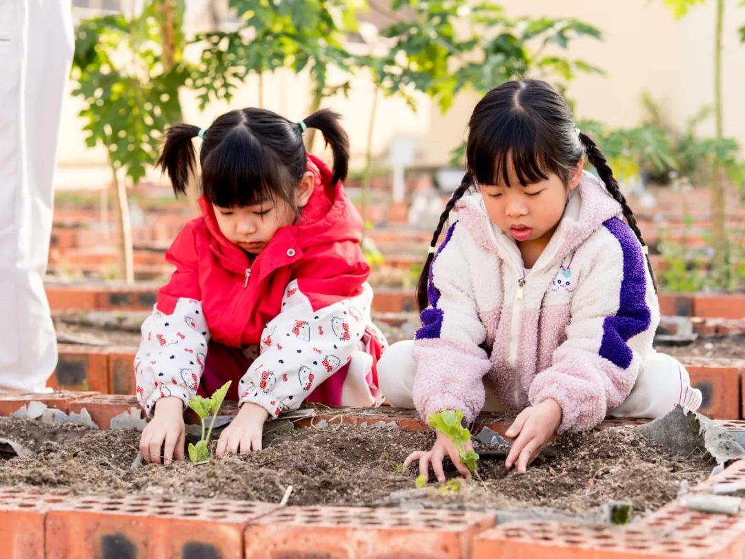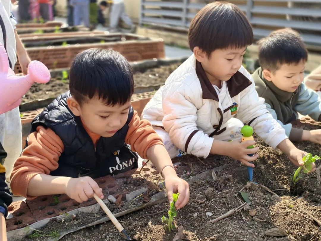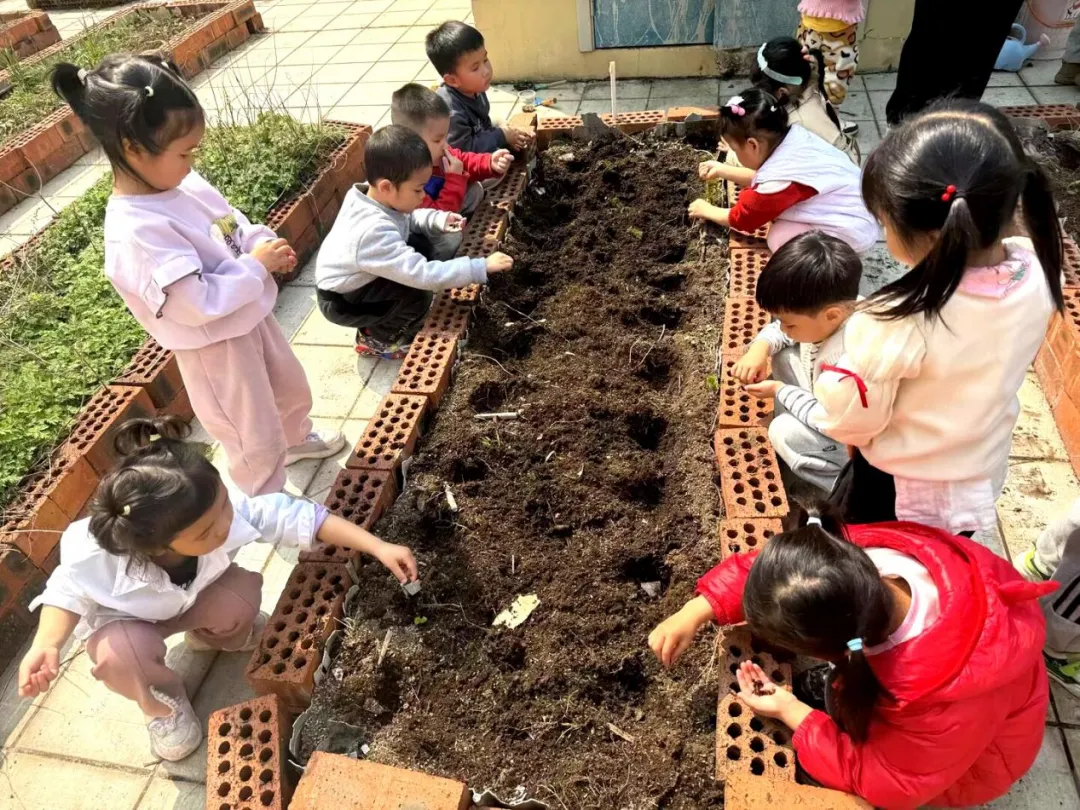 认识种子、了解种植要点后,孩子们化身小小园丁,撸起袖子、拿起工具,在老师的陪伴下开启了种植实践。大家分工合作,有的认清理种植区的杂草;有的合力把坚硬的泥土变得松软平整;还有的小心翼翼地种苗、播种,将小小的秧苗和种子轻轻埋进泥土里。