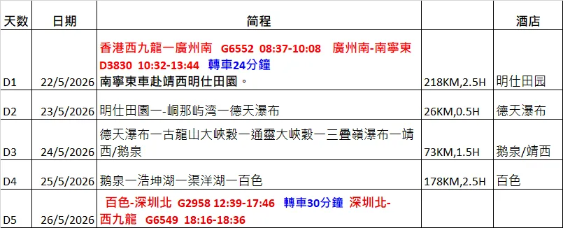 D1: 2026年5月22日 218KM,2.5H香港西九龍一廣州南 G6552 08:37-10:08 廣州南-南寧東 D3830 10:32-13:44 轉車24分鐘