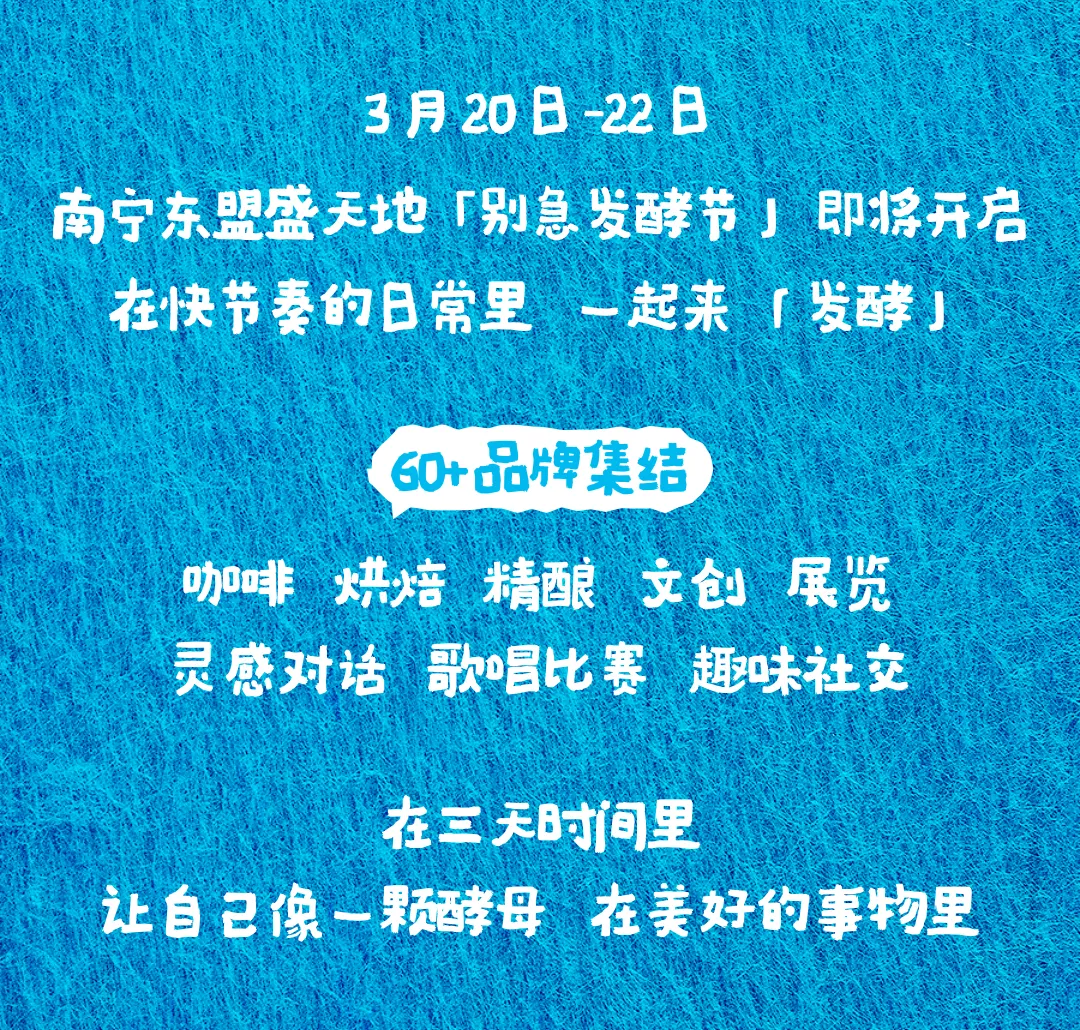 南宁首个慢生活发酵灵感市集「别急发酵节」,3月20日-22日,用三天时间,和我们一起,让生活慢慢发酵,等一杯咖啡从豆子变成香气,等一场对话从客套变成交心,等自己在这个春天,从紧绷变得松弛。