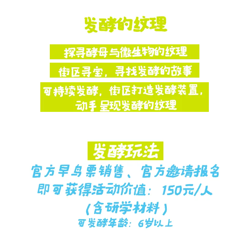 研学跳出传统课堂,一起探寻酵母与微生物的奇妙纹理,发现微观世界的美学密码;开启街区寻宝之旅,在盛天地的角落寻找藏在生活里的发酵故事;更能动手实践可持续发酵理念,在街区共同打造发酵装置,用创意呈现独属于发酵的美。