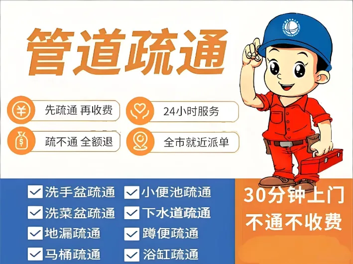 提供24小时同城上门疏通服务,包括下水道疏通、管道清洗、马桶疏通、地漏疏通、浴缸疏通、菜池疏通等。