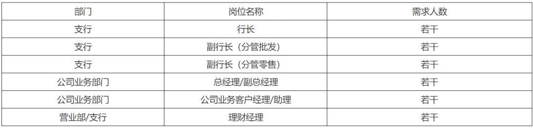 · 6年以上银行相关工作经验,3年以上批发银行业务及网点相关经营管理经验