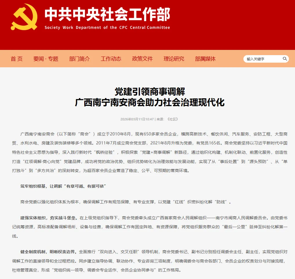 广西南宁南安商会(以下简称“商会”)成立于2010年8月,现有650多家会员企业,横跨高新技术、餐饮休闲、汽车服务、安防工程、大型商贸、水利水电、房建及装饰装修等多个领域。2011年7月成立商会党支部,2021年8月升格为党委,有党员165名。商会党委坚持以习近平新时代中国特色社会主义思想为指导,深入践行新时代“枫桥经验”,积极探索“党建+商事调解”新路径,通过组织化构建、机制化联动、前置化服务,创造性打造“红领调解·商心向党”党建品牌,成功将党的政治优势、组织优势转化为治理效能与发展动能,实现了从“事后处置”到“源头预防”、从“单打独斗”到“多方共治”的深刻转变,为超百家会员企业营造了稳定、公平、可预期的营商环境。