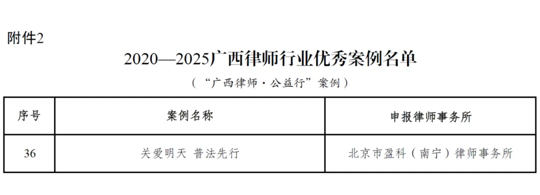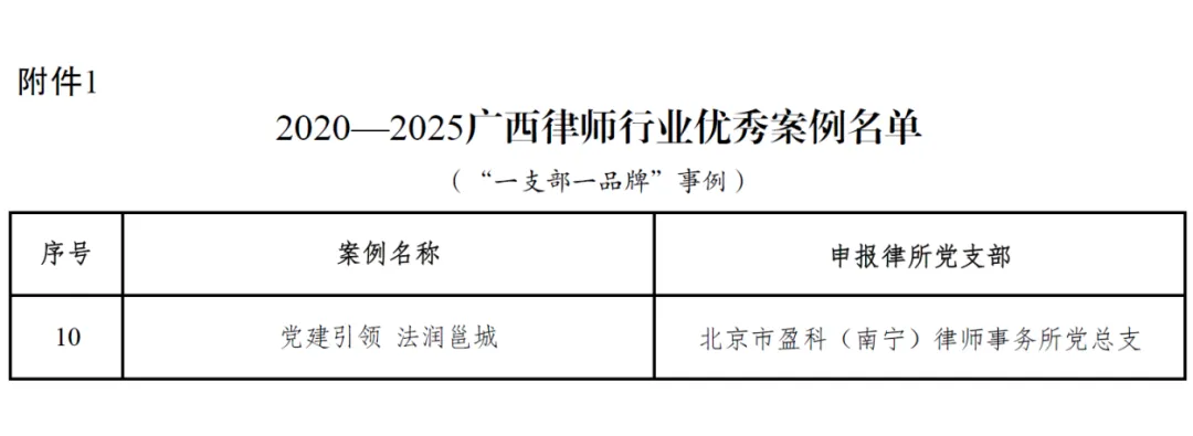 近日,广西律师协会公布“2020—2025广西律师行业优秀案例名单”。本次优秀案例推选活动旨在深入贯彻落实习近平法治思想,展示五年来广西律师在党建、公益、法律服务各专业领域取得的成果,经多轮审核评选,最终确定350个优秀案例入选,涵盖“一支部一品牌”、“广西律师·公益行”、律师专业领域案例三大类别。