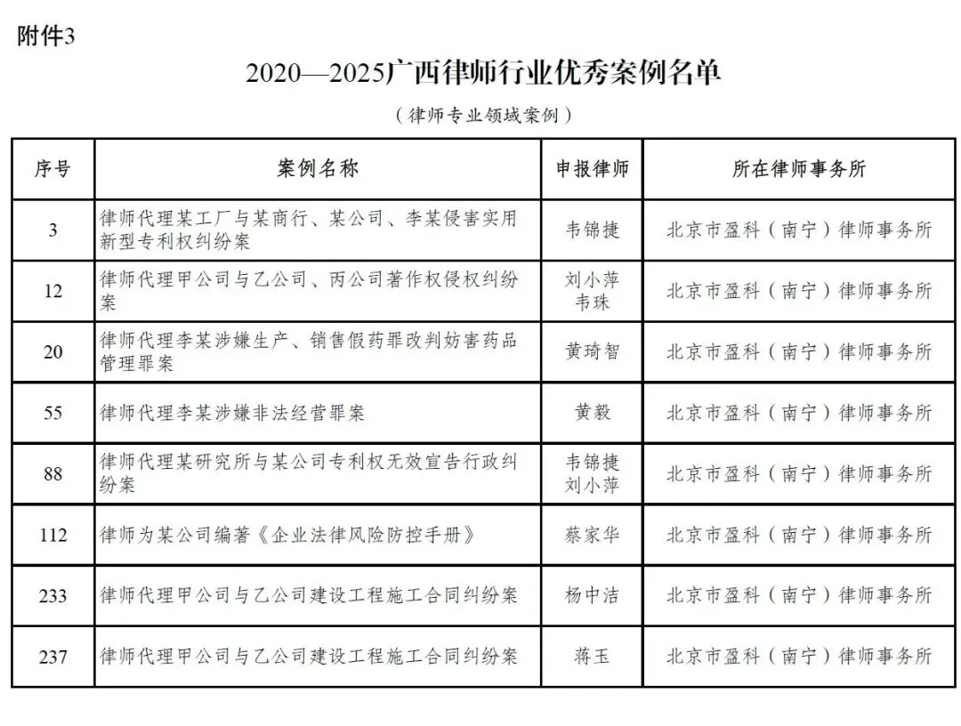 此次多项案例入选,不仅是对律所专业能力的高度认可,也是对律师执业初心的激励。未来,盈科南宁将持续深耕专业领域,强化人才培养,以更优质的法律服务为法治广西建设贡献盈科力量。