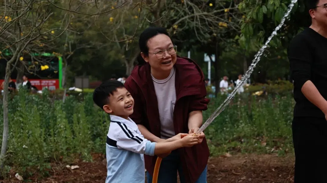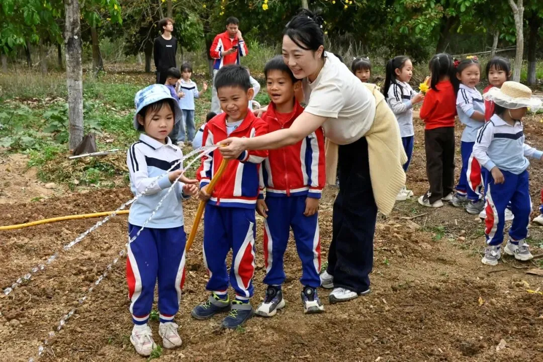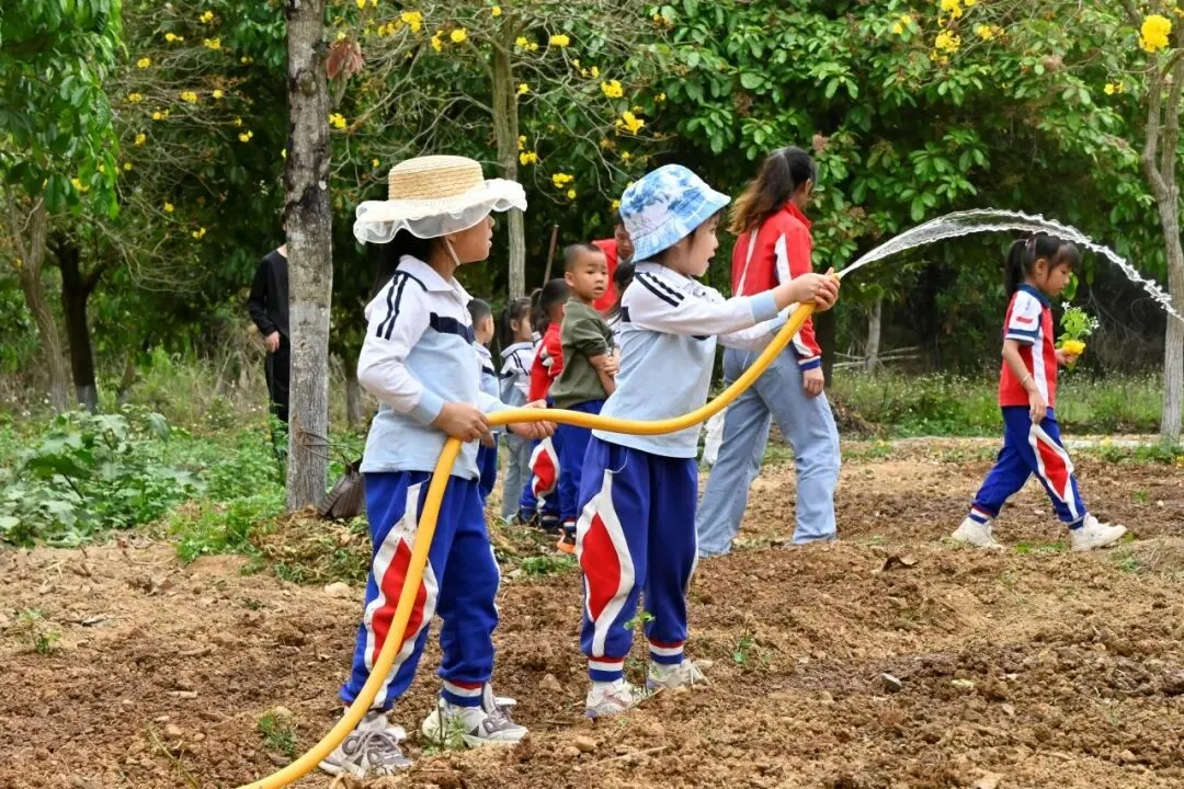 水管里的水流缓缓淌过老师牵着萌娃的手师生并肩而立水流滋润泥土笑声漫过田间把对自然的热爱浇进每一寸生长的土壤