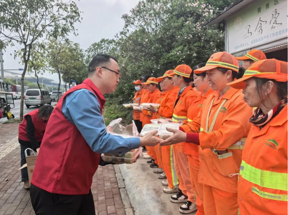活动当天,三支党员小分队分头行动:第一组前往科创餐厅领取爱心午餐,送至青秀环卫长虹路工会爱心驿站;第二组从轨道优厨御澜上城餐厅取餐,送往南宁建宁中环城市服务有限责任公司良庆项目部;第三组驻守轨道优厨剧场公寓餐厅,为就近作业的环卫工人现场派餐。