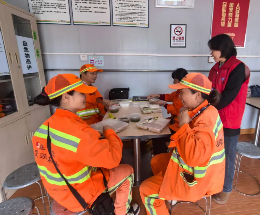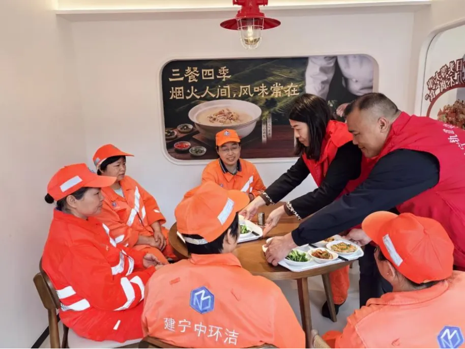 中午11点30分,结束清晨清扫工作的环卫工人陆续抵达各服务点。“阿姨,您辛苦了,快趁热吃!”志愿者们主动上前递餐、热情问候,驿站里瞬间充满暖意。一份荤素搭配的饭菜,一句简单的“您辛苦了”,让常年奔波在街头的环卫工人们真切感受到来自社会的尊重与关怀。让这顿饭暖了肚子,更暖了心窝。