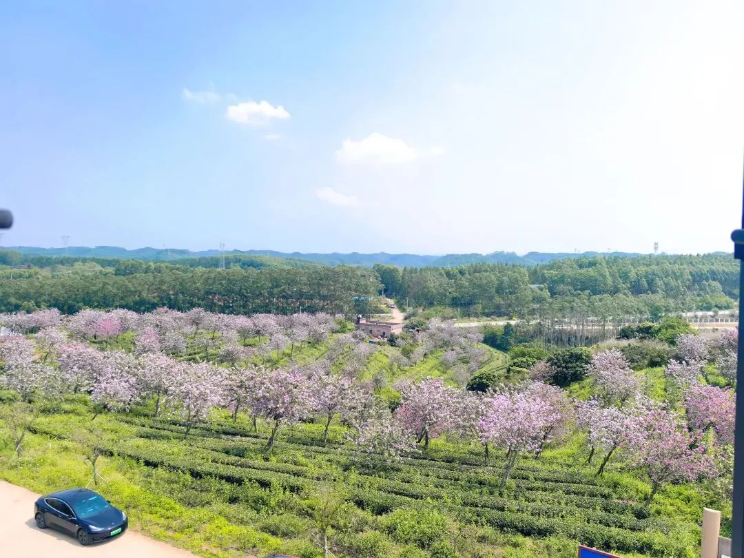 层层叠叠的茶树顺着山势铺展,深绿的叶片在阳光下泛着油亮的光,与粉樱、金铃交织成一幅层次丰富的画卷。沿着茶田间的小径漫步,鼻尖萦绕着淡淡的茶香,连脚步都不自觉慢了下来。