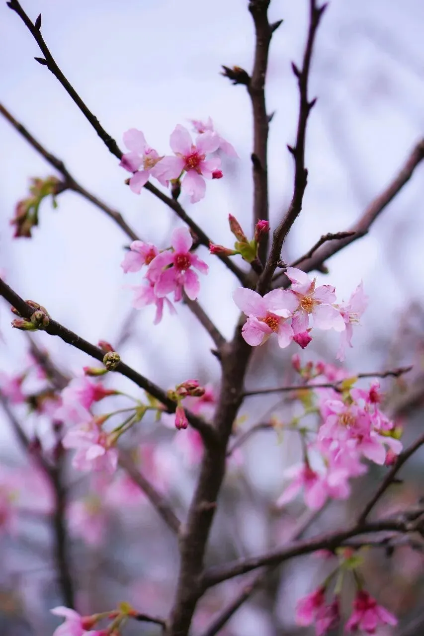 粉嫩的山樱缀在深褐的枝桠间,五片花瓣温柔舒展,花蕊带着细碎的金,风一吹便簌簌落下,像一场温柔的樱花雨。凑近看,花苞还带着青涩的绿,仿佛下一秒就会绽放成满树温柔。
