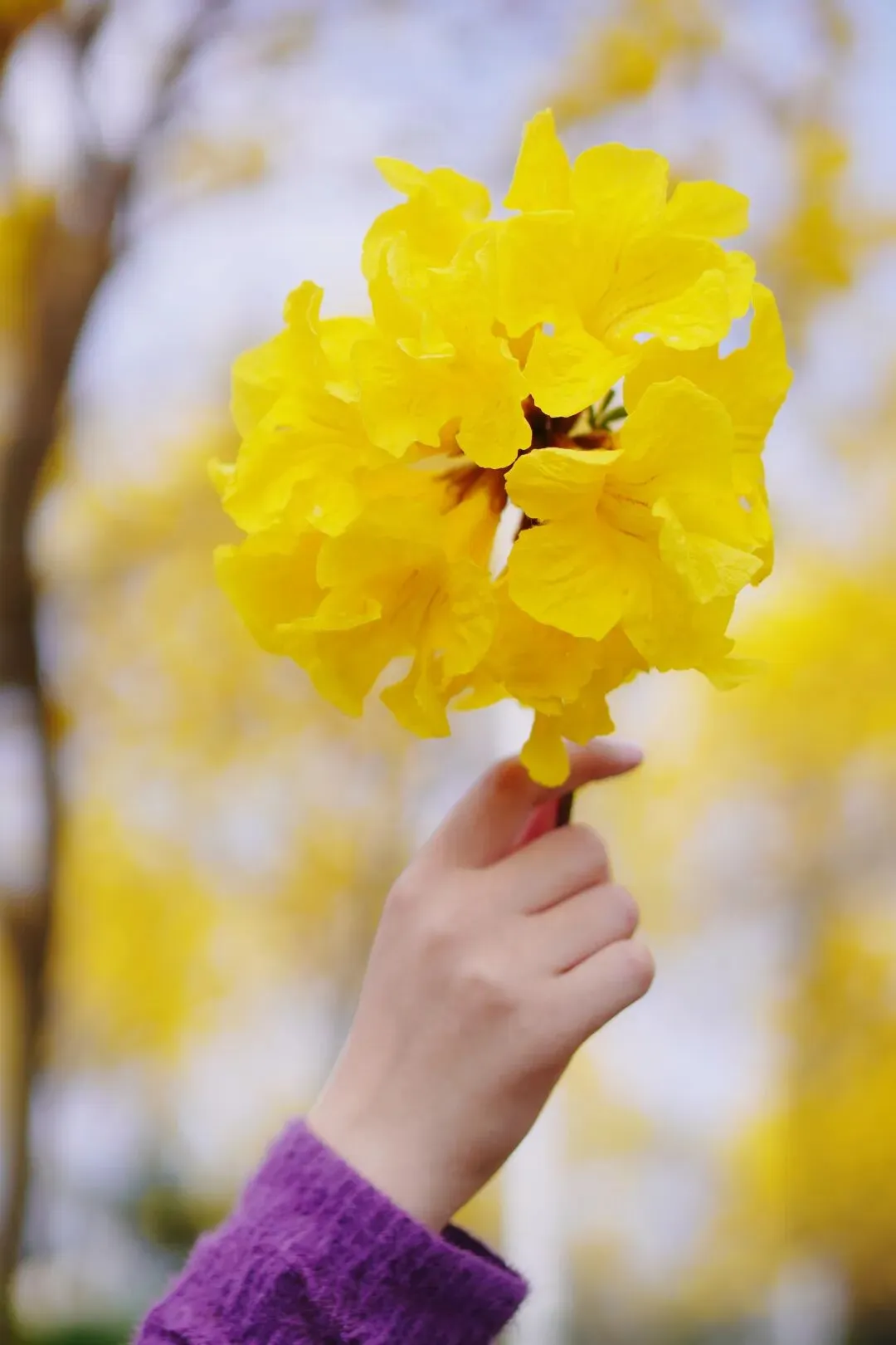 整棵树的叶子都落尽了,只剩下满枝金黄的花朵,像一串串小铃铛挂在枝头,在阳光下闪着光。抬头望,蓝天被金色的花簇切割成细碎的光斑,连风里都裹着暖融融的气息。随手捡一枝落在地上的花(文明赏花,切记不要折枝哦),捧在手心,就是一捧春日的阳光。