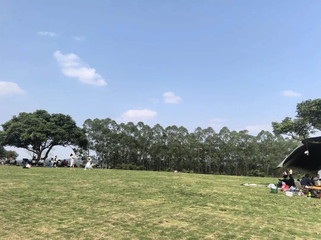 蓝天下,人们支起天幕,铺开野餐垫,孩子们在草地上奔跑放风筝,大人们围坐聊天,笑声混着风声飘向远方。远处是连绵的青山,近处是盛放的花树,时间在这里仿佛被按下了慢放键,所有的焦虑与疲惫,都被这开阔的山野温柔消解。