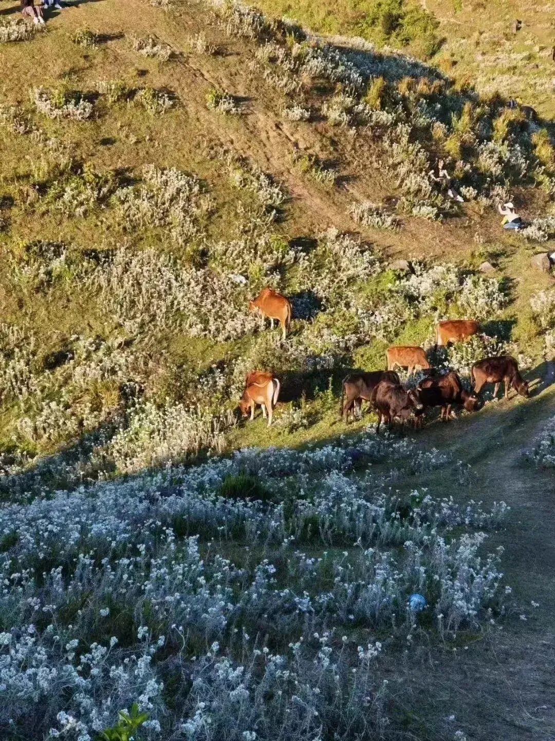 靖西乌鸦山地处古龙山山脉主峰,海拔约1233米,山体由花岗岩构成,几座连绵起伏的浑圆状山坡构成了其独特的地貌。这里是一处尚未被商业开发的天然秘境,以其原生态的高山草甸和季节分明的自然景观而闻名,被誉为“广西小瑞士”,徒步登山是主要的游览方式,从陇庇屯出发,沿途穿过清香八角林和原始森林,约一小时可登顶。山顶视野极为开阔,可360度环视层叠峰林,遇到云海时景色更为壮观。