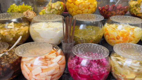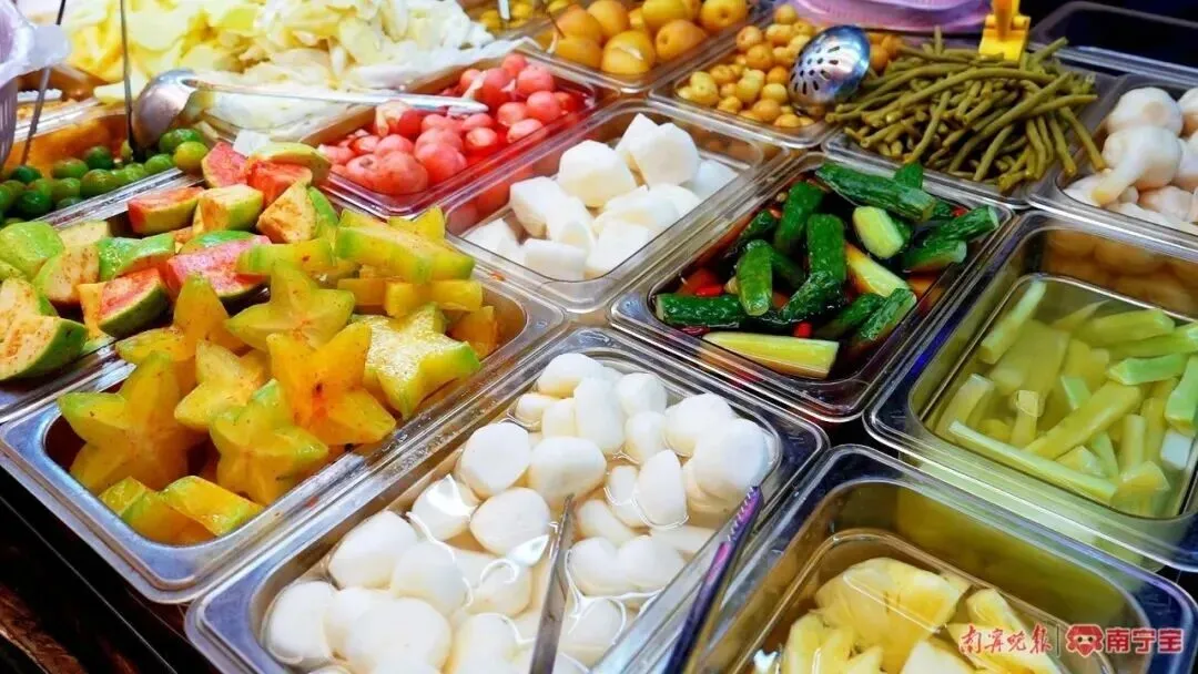 而最具代表性的,当属南宁酸嘢——酸中带甜、甜里透酸,芒果、菠萝、李子、萝卜被酸梅粉、辣椒盐包裹,一口下去,酸甜脆爽,像极了青春里那些又甜又涩的小情绪,让人越吃越上头。
