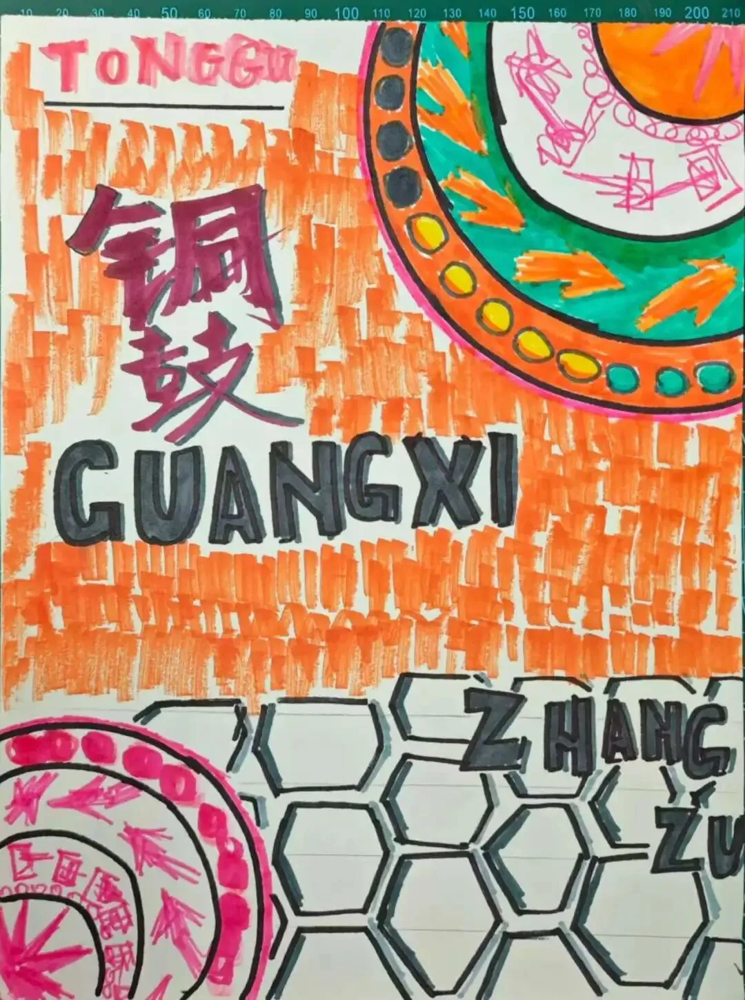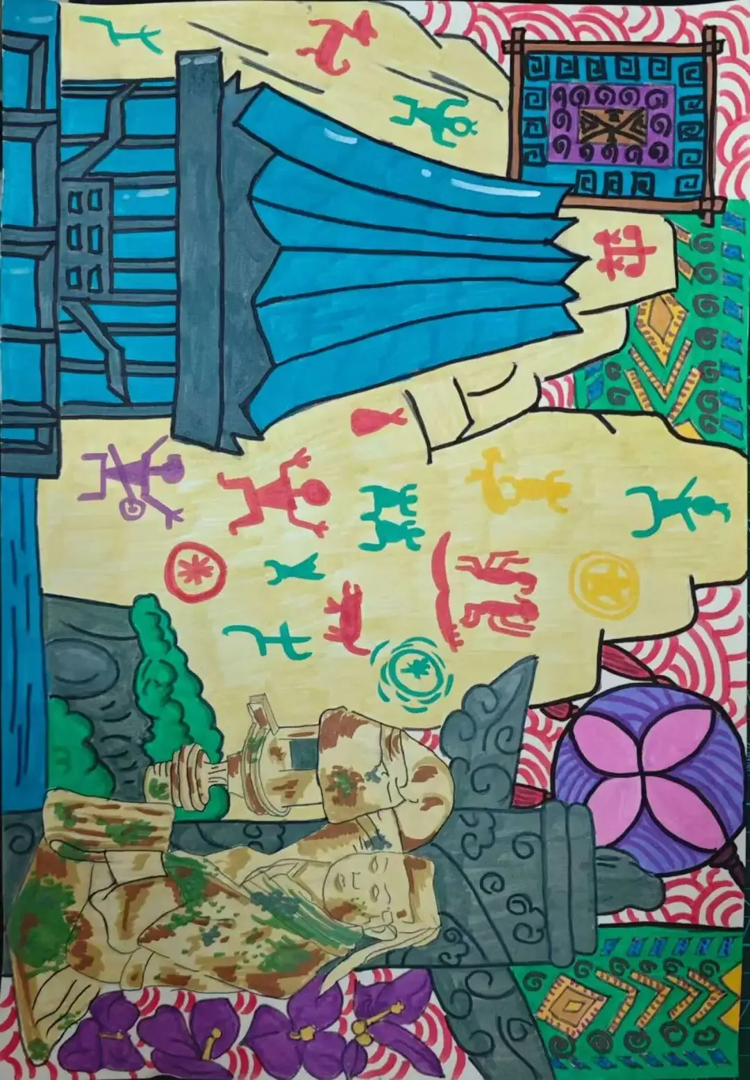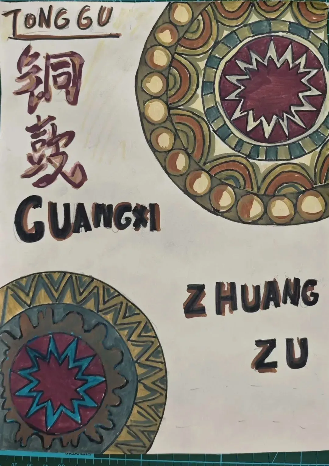 云端研学结束后,两校学生同步走进各自学校的美术室,将VR课堂中的所见所感转化为创作灵感。他们采用手工、绘画等形式,有的用黏土复刻铜鼓纹饰,有的用水彩描绘壮锦图案,还有的以花山岩画为原型创作创意画作。在动手实践中,学生们将对壮乡文化的理解融入作品,让云端研学成果落地生根。通过“云端参观+线下创作”的联动,两校学子在探寻壮乡文脉的过程中,进一步增强了对中华文化的认同感和自豪感,坚定了文化自信。