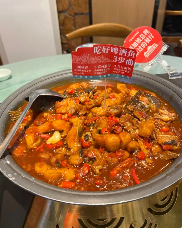 - 中:啤酒鱼,鱼皮微脆、肉细嫩,汤汁带一点酸甜,配米饭很稳