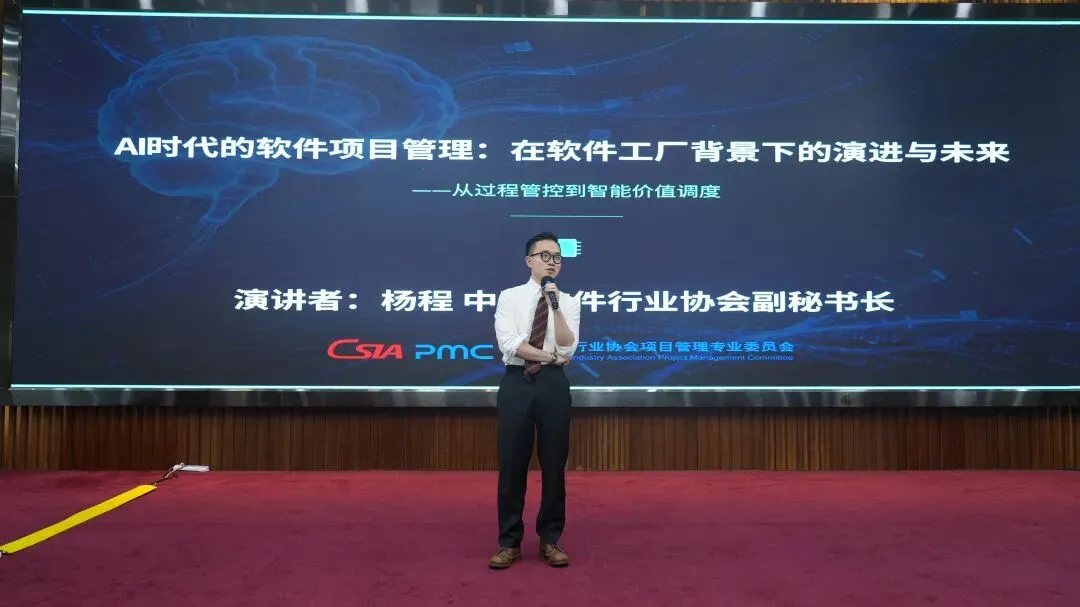 中国软件行业协会副秘书长、国防科技大学副教授杨程先生带来题为《AI时代的软件项目管理:在软件工厂背景下的演进与未来——从过程管控到智能价值调度》的主题分享(见图7)。杨程副秘书长的分享全面而深入,他从软件工厂的兴起背景切入,系统阐述了AI技术如何渗透研发全流程,并前瞻性地描绘了未来项目管理者的能力模型。他核心指出,数智化项目管理标准将为AI战略落地提供全方位支撑,而项目管理者的角色也将随之深刻转型——从传统的过程管控者升级为统筹业务价值与智能研发体系的总调度官。