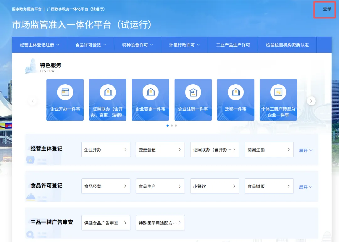 2.进入主页后下拉,点击进入“市场监管准入一体化平台”。