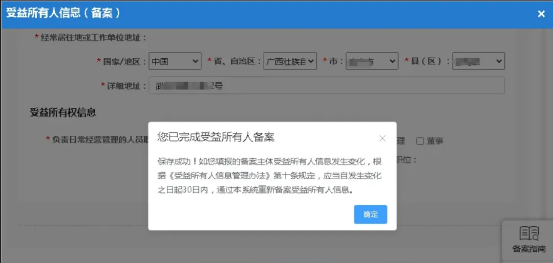 13.填报所有信息后点击“确定”,即完成受益所有人备案。