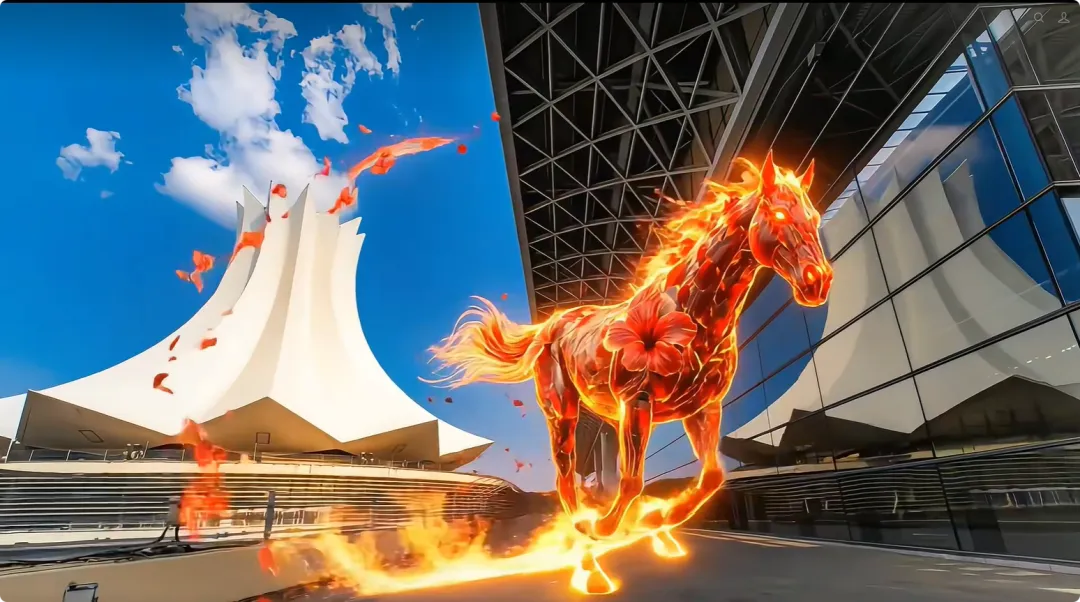 《马跃新程 槿上添花》创作于新年期间,巨大的朱槿花在数字世界中绽放,让南宁国际会展中心在光影中呼吸,化作一匹“朱槿炎驹” 驰骋于建筑之间,寓意红红火火,马到功成。