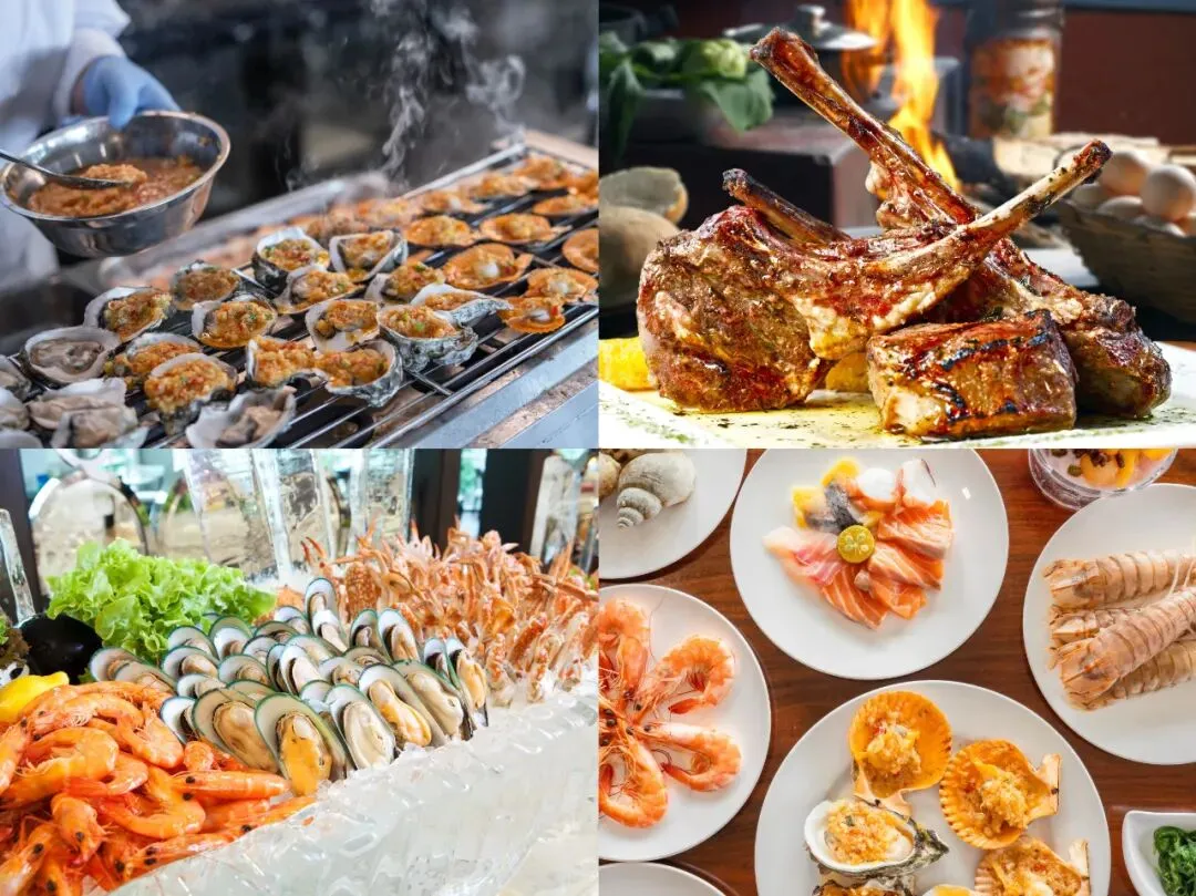 五象山庄自助餐厅,海鲜爱好者天堂。新西兰青口贝、加拿大翡翠螺、北海大车螺、钦州生蚝、北部湾兰花蟹、现切三文鱼、金枪鱼、希鲮鱼刺身...各类海鲜应有尽有,现煎羊排,鸡扒,成人还有星厨精心烹制位上菜品、海鲜和肉类吃饱了还可以来点西式甜点解解腻~