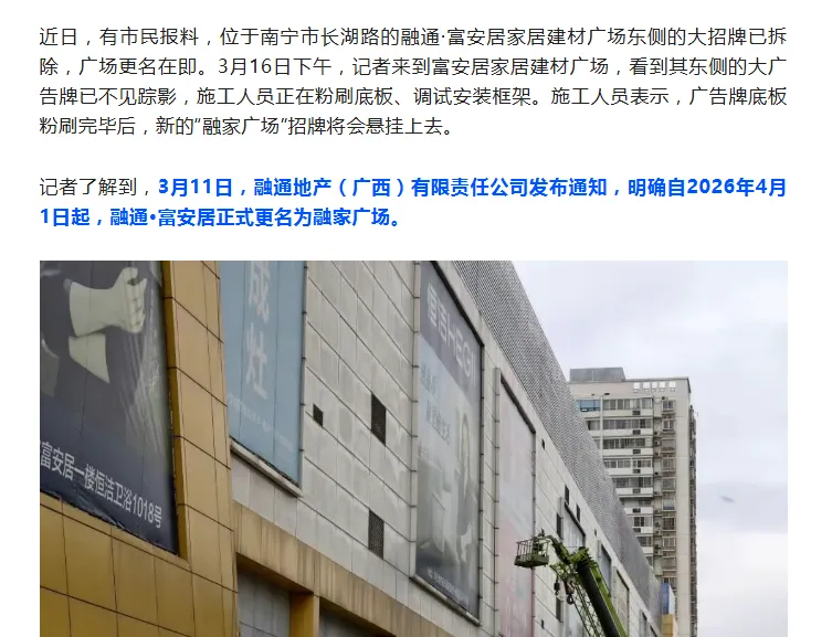 据南宁新闻网报道,融通地产(广西)有限责任公司已正式发布通知:2026年4月1日起,融通·富安居正式更名为融家广场!