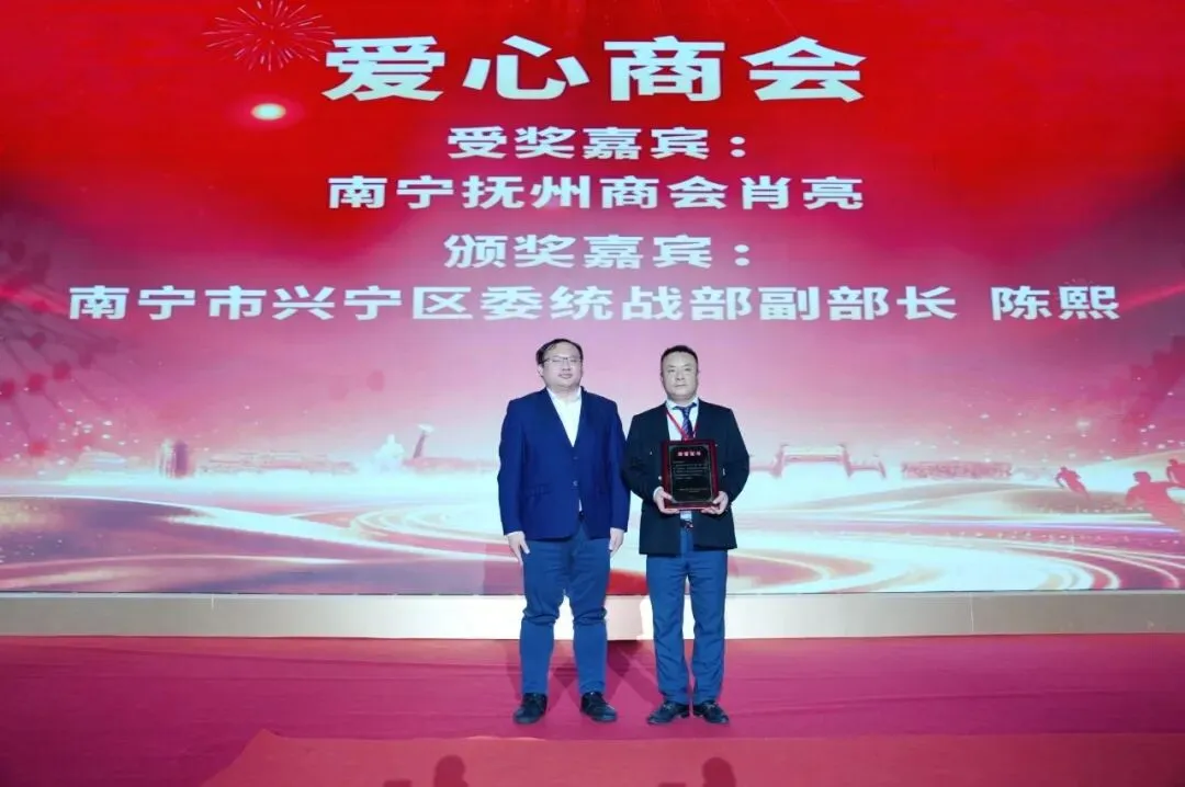 ▲南宁市兴宁区委统战部副部长陈熙为南宁抚州商会颁发爱心商会荣誉证书(秘书长肖亮代表商会领奖)。