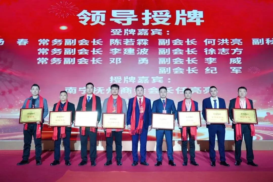 ▲南宁抚州商会会长任亮亮为增补的执行会长、常务副会长、副会长正式授牌。