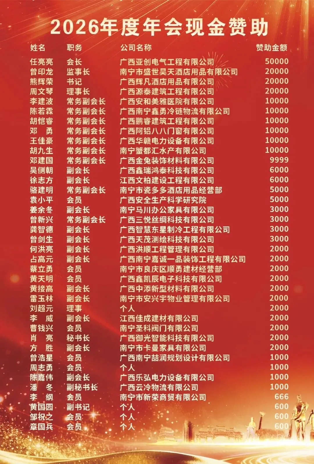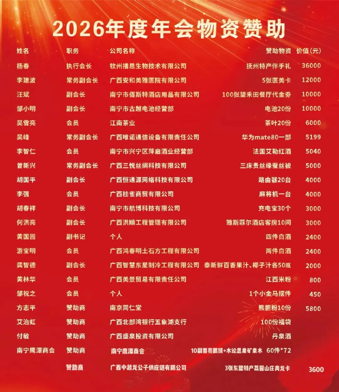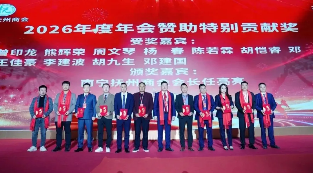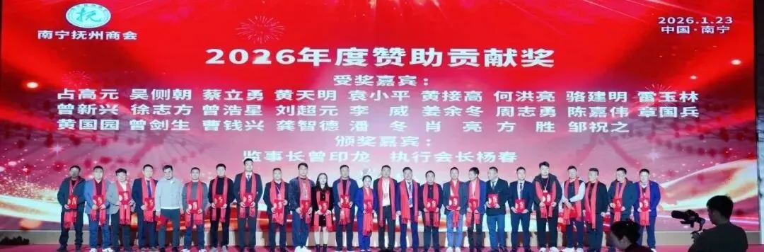 邕有抚商,共赴未来!南宁抚州商会第一届第二次会员代表大会暨2026年迎新年会晚宴,在温馨喜庆、激昂奋进的氛围中圆满落下帷幕。这是一场意义非凡的盛会。我们以庄严的国歌致敬祖国,在各级领导的殷切寄语中汲取前行动力。这是一次荣耀的见证,爱心善举与责任担当在授牌颁奖中熠熠生辉,卓越贡献与团结奋进在掌声中被共同铭记。这更是一次情谊的欢聚,在祝酒的豪情中凝聚共识,在精彩的节目与迭起的抽奖中共享喜悦,歌声与笑声汇成了属于全体抚商家人的温暖记忆。盛会虽已落幕,征程再启新篇。让我们带着这份荣耀、感动与祝福,在新的一年里继续同心同行,携手并肩,共赴更加辉煌灿烂的未来!特别鸣谢以下单位及个人: