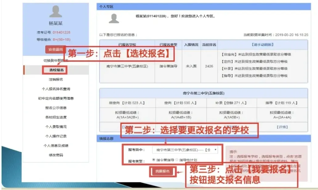 选高中第一步:拿到中考成绩后,通过“南宁市中考成绩分布情况表”(也叫一分一档表)查询到自己的全市排名。第二步:参照上一年度各个高中录取最低成绩对应的排名,(看我往期文章,已帮大家整理好各高中最低录取成绩及排名)就可以大致知道自己能报哪些高中了,选出3-4所高中作为备选。第三步:按照上述时间登录“南宁市中考招生信息网”进行填报志愿,以下是相关注意事项:一,中考招生报名系统录取工作是在16:00-18:00进行,当天18:00后就可以查看录取结果、部分19:30后显示录取结果。二,16:00前可以更改志愿,但系统有可能因为在线人数过多导致卡顿或崩溃,建议在15:40之前完成改填志愿的操作。三,系统5分钟会更新一次数据,但是不会自动刷新。学生和家长需要手动刷新查看自己选填学校的入围情况!如果未入围就要及时改填志愿,最后一次改填志愿一定要在15:40前完成操作。入围的意思是指当前时间内你在所选填的学校的所有考生的成绩排名靠前,但仅限当前时间。在16:00前如果还有新的考生加入竞争,系统会重新以招生类型按成绩高低排序,具体的入围情况要看当天的竞争情况。而录取工作是在16:00关闭报名后才进行的。因此再次强调一定要在15:30左右关注自己的入围所处的排名情况,并及时完成选填志愿的操作。注意:一般15:30才稳定。五,如果排名不够,系统会显示“未入围”,且注明“所在初中定向名额已满”、“您不是地段生”等细节,此时就需要更改志愿。六,更改志愿的次数没有限制,建议在15:40前完成操作。七,如果系统崩了进不去看实时排名,恢复后重新进入还会保留之前选报的学校。八,当天16:00一到系统就会立即关闭报名,为了避免来不及改填志愿的问题出现,一定要在15:40之前确认自己的入围排名是否安全!!否则就要考虑是否更改志愿。九,定向补录指的是:公办示范性高中按照教育主管部门的要求分配给各个初中地段生的指标名额。而定向名额的使用条件必须满足2个条件:一是考生通过校内竞争获得定向名额,二是考生成绩不低于所报批次示范性高中要求的录取最低成绩。只要有一项没达标就会有空出来的定向名额,这些名额会在当天放给报名了该校的市区户籍全体考生统一竞争并按成绩排名由高到低录取。往年五象三中会空出一百多个定向空余名额,南宁市户籍生并且选报了五三(排名约2800内)、非定向、定向和指导性都没有入围,就有获得定向空余补录的机会!