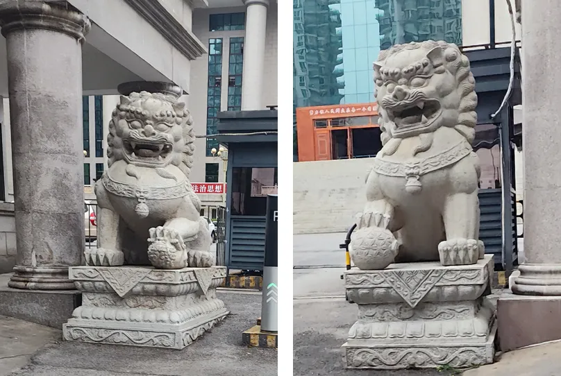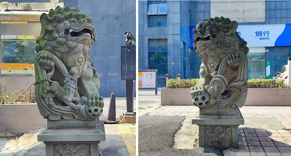 石狮子都是成对摆放的,而且有明确的“男左女右”规矩——从门里往外看,左边的是雄狮,右边的是雌狮。雄狮大多踩着一个彩球,这可不是单纯的玩耍,彩球象征权势与寰宇,民间常说 “狮子滚绣球,好事在后头”,寓意事业顺遂、万事称心。雌狮则通常怀抱着一只小狮子,代表着子孙昌盛、家族兴旺,寄托着中国人 “多子多福” 的传统期许。也有不少雌狮脚下踩着小狮子,这种造型多出现在执掌法度、维护公正的机构门前,寓意法理严明、子嗣守法,也象征着公平公正、安定有序。