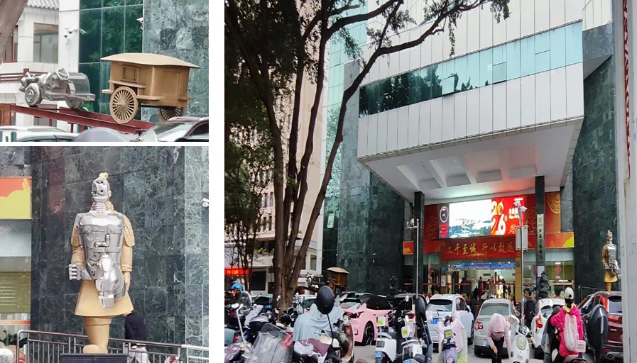 说到特别,我还见过一处很特别的门口陈设,除了经典石狮子,还有两座造型别致的塑像,前半部分是充满现代科技感的金属质感造型,后半部分则为古朴的兵马俑形制,巧妙呈现出从传统到现代的传承与跨越。另一座则前半为汽车造型、后半为马车形制,整体风格庄重大气,与一旁的石狮相映成趣,视觉效果很有特色。