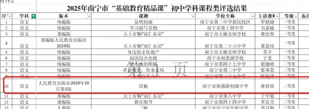 南宁市基础教育精品课评选活动荣获初中学科类二等奖