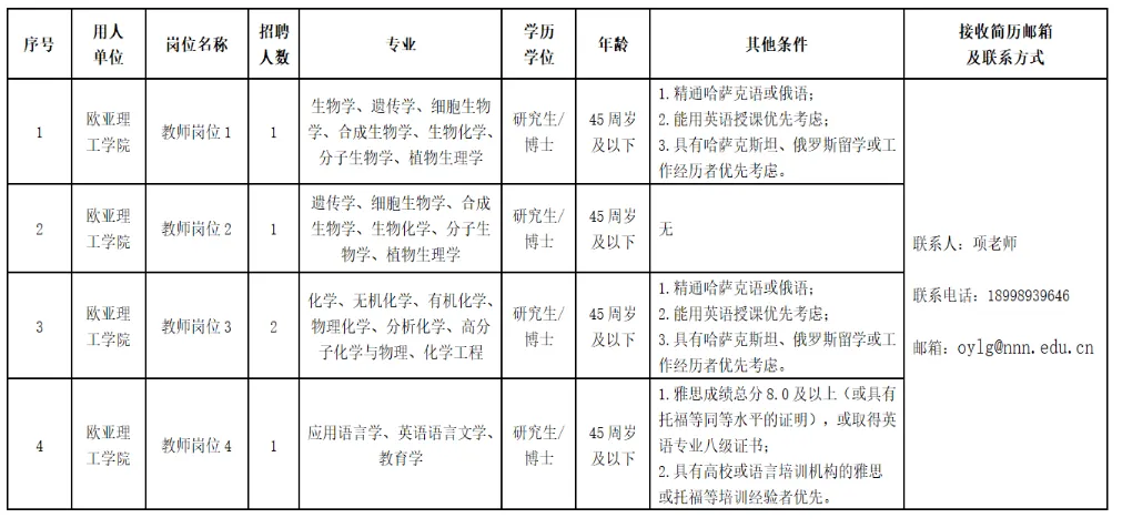 2025年5月,教育部正式批复同意我校与哈萨克斯坦欧亚国立大学合作举办非独立法人中外合作办学机构—南宁师范大学欧亚理工学院。欧亚理工学院以服务“一带一路”倡议和中哈命运共同体建设为使命,旨在充分发挥中哈两校优质教育资源,面向生物科学、化学及应用化学领域,培养具有扎实学科理论基础、创新实践能力及国际化视野的高素质复合型人才。现根据欧亚理工学院发展需要,面向海内外招聘优秀博士人才。