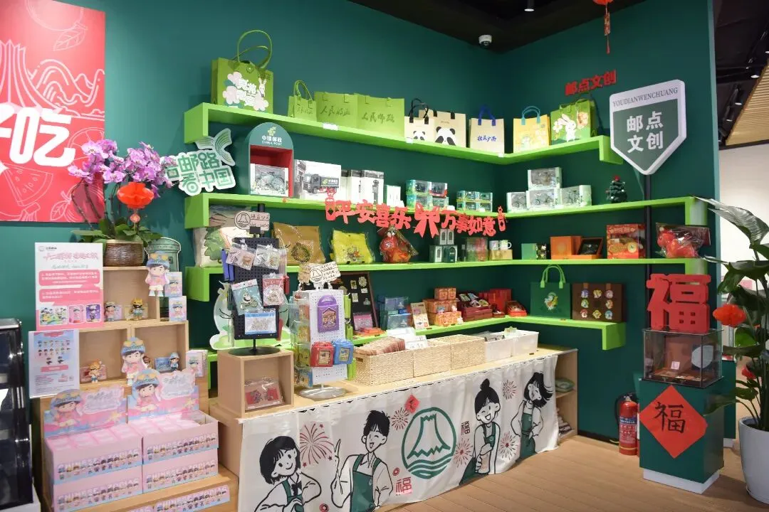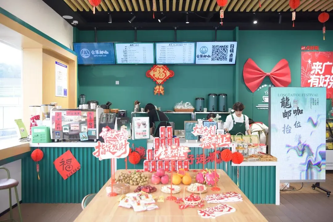 会展邮咖总面积400平方米,室内面积约180平方米,分为:邮政服务、盟YOU空间、方寸天地、邮点文创、YOU点好吃、绿驿茶咖六大功能区域,以“展会服务延伸+邮政便民服务+休闲社交文化”为核心定位,既延续了邮政的便民基因,又深度融入会展特色与地域文化,让“会展在哪,邮政便捷服务就到哪”。