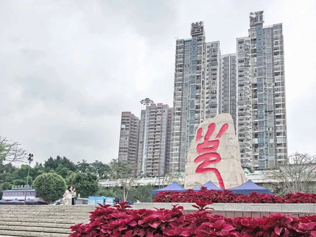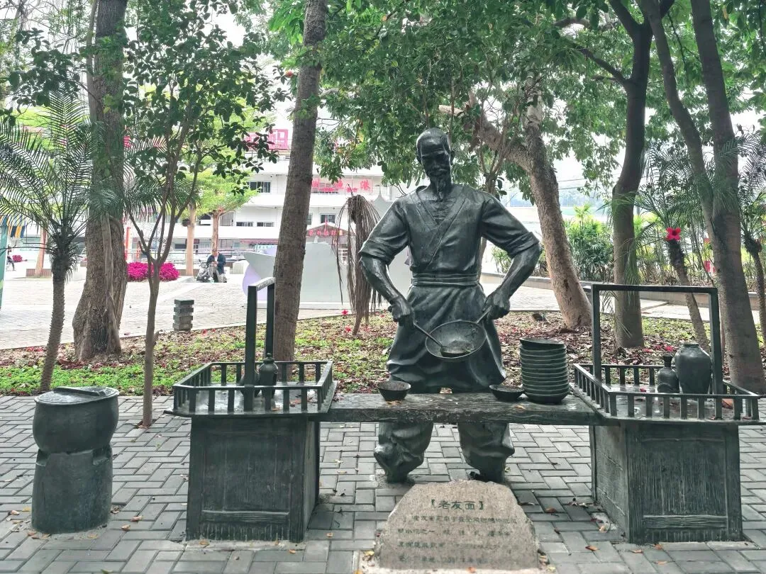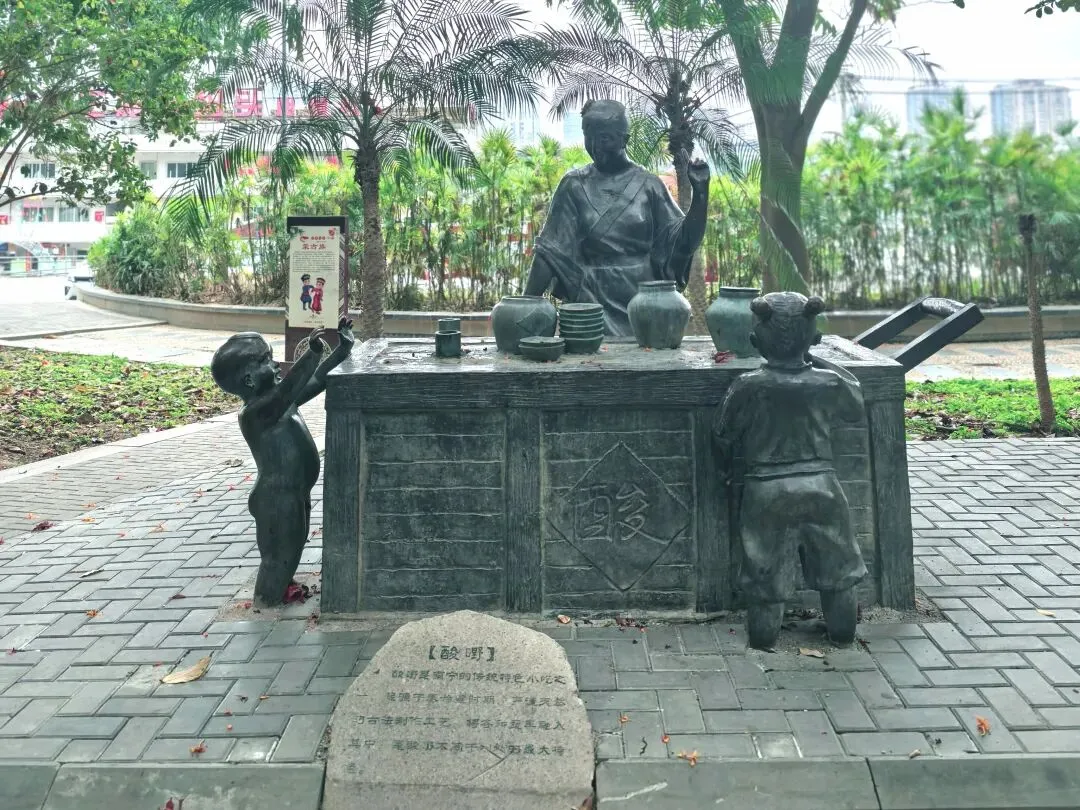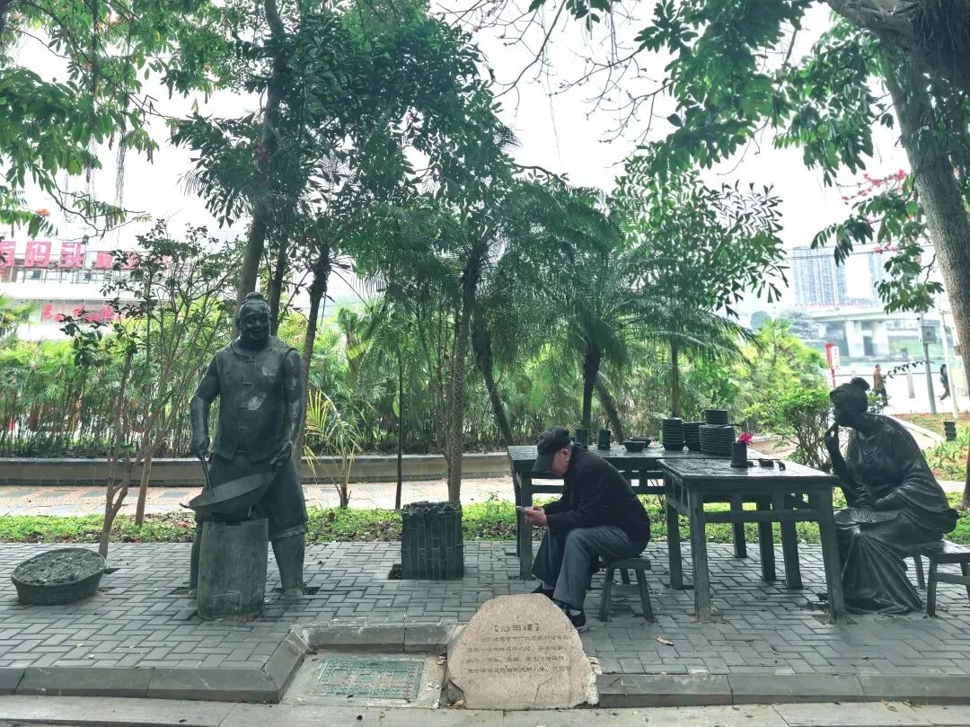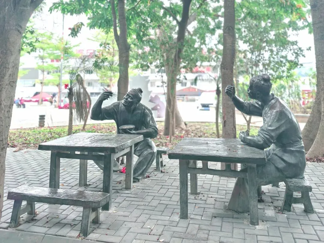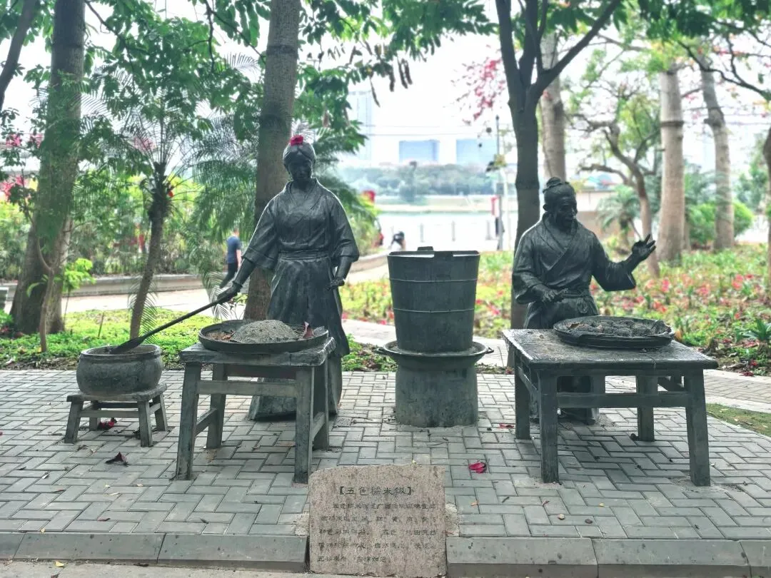 江岸则是另一番人间烟火。酸嘢摊前,农妇的石筐里,木瓜、萝卜、芒果……依着酸醋的魂,凝成翡翠与琥珀。旁边老友粉的镬气仿佛还未散尽,石雕的扁担两头,一头是滚烫的汤锅,一头是食客虚位以待的小凳。更妙的是那桌炒田螺,食客俯身的姿态,螺壳空堆的细节,让“嗦”的一声脆响,几乎要破石而出。五色饭的蒸笼,则蒸腾着壮家三月三的糯香,与江水淡淡的腥气缠绵在一处。喧闹的边缘,读书的少年是静的。他膝上摊开的,或许就是那本《邕州府志》。江风翻不动石质的书页,却将“绿城”二字,吹进了他永恒的晨读里。我忽然懂了。那“邕”字碑是这部史诗的扉页,而这些石雕,才是它鲜活的正文。江水不止在“川”与“邑”的古老结构里流淌,更在酸嘢的酸、老友粉的辣、田螺的鲜与书页的墨香里,奔流不息。