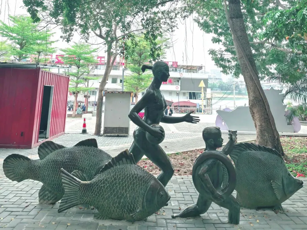 最动人是那对母子泳者。母亲手握一泳球,手臂前伸,向前奔跑;孩子肩挎游泳圈,大步跑在她的前面。此时,你若闭上双眼,仿佛会看到他们跃入江中奋臂划水的模样呢!那些胖胖的鱼儿似乎也不甘落后紧紧地追赶着……石头的冷硬,竟雕出了肌肤的温润与衣褶的颤动。我仿佛听见几十年前,那位在冬泳亭畔畅游的老者的笑声,正顺着这对母子的身影,在江面上粼粼地荡开。