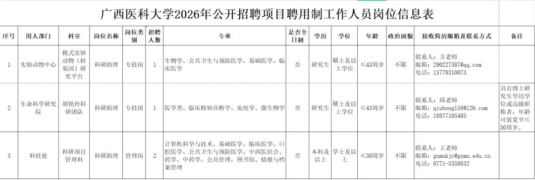 1.广西医科大学2026年公开招聘项目聘用制工作人员岗位信息表