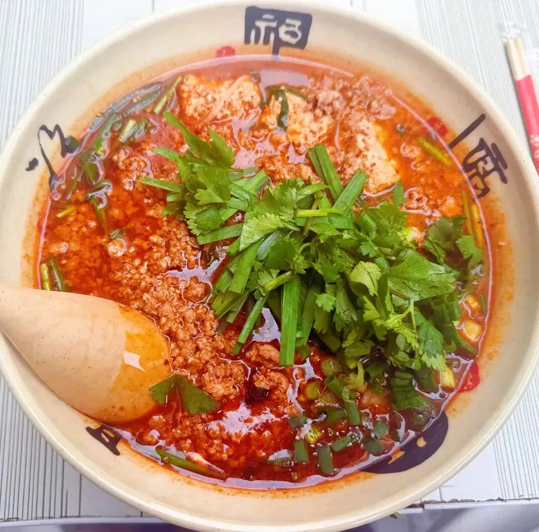 我第一次点的是招牌肉末豆花米线,端出来的时候,红亮的汤汁裹着细碎的肉末,嫩白的豆花藏在底下,上面撒满了葱花和香菜,光是看着就让人食欲大开有没有。