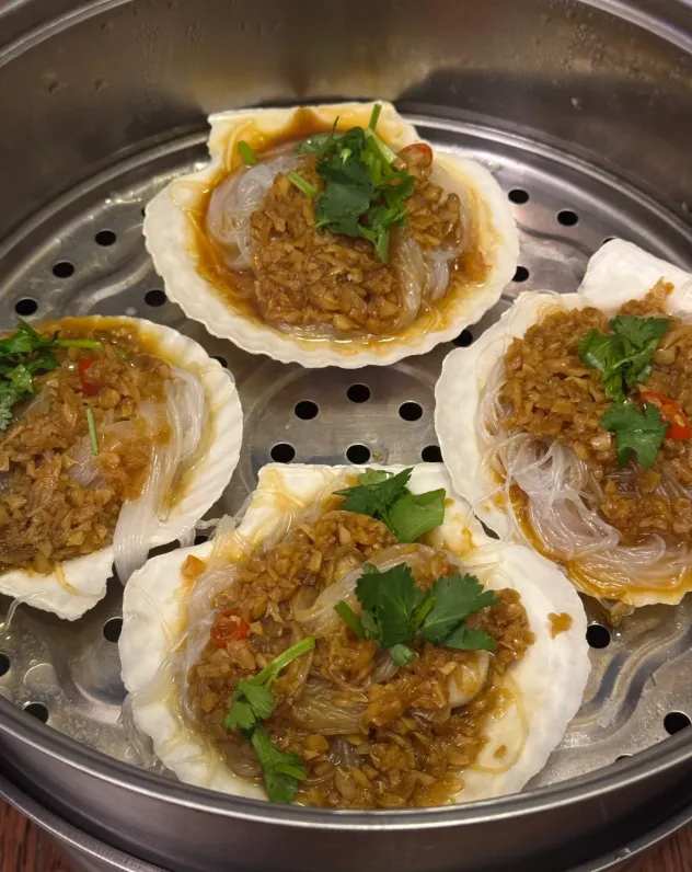蒜蓉粉丝蒸扇贝。粉丝先泡软铺底,扇贝开壳洗净放上去,蒜末用热油一激,香味立刻窜出来,再加一点生抽和葱花,蒸个七八分钟就行。端上来别急着吃,先闻一下,海的甜和蒜的辣会在鼻子里打个结,解开了才下嘴。