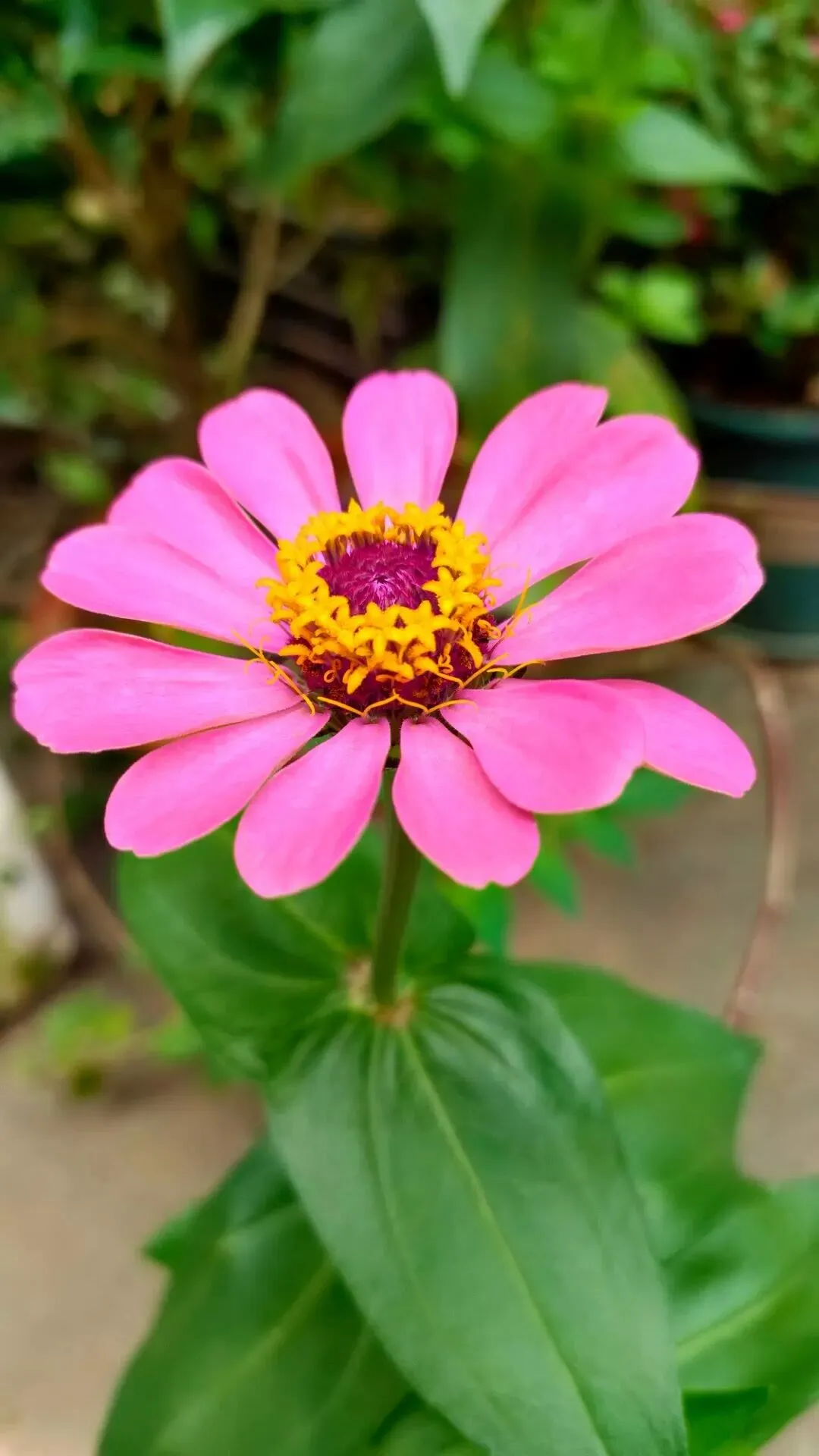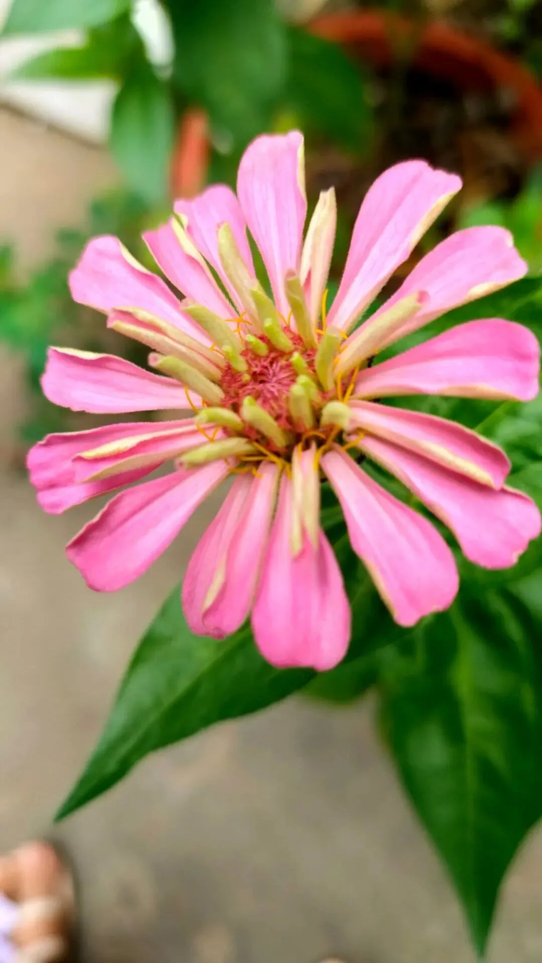 第一个月,百日菊的茎杆蹿到了半米高,新叶裹着绒毛像小巴掌;一个半月后,花骨朵攒成了小灯笼,粉瓣裹着金芯藏在叶缝里;到了第二个月,整箱花彻底“炸”了——粉花瓣挤得箱沿都装不下,花杆顶着花头晃得像串点燃的烟火,连路过的学生都趴在防盗窗边喊:“阿姨,这花能送我一朵吗?比我画的水彩还好看!”