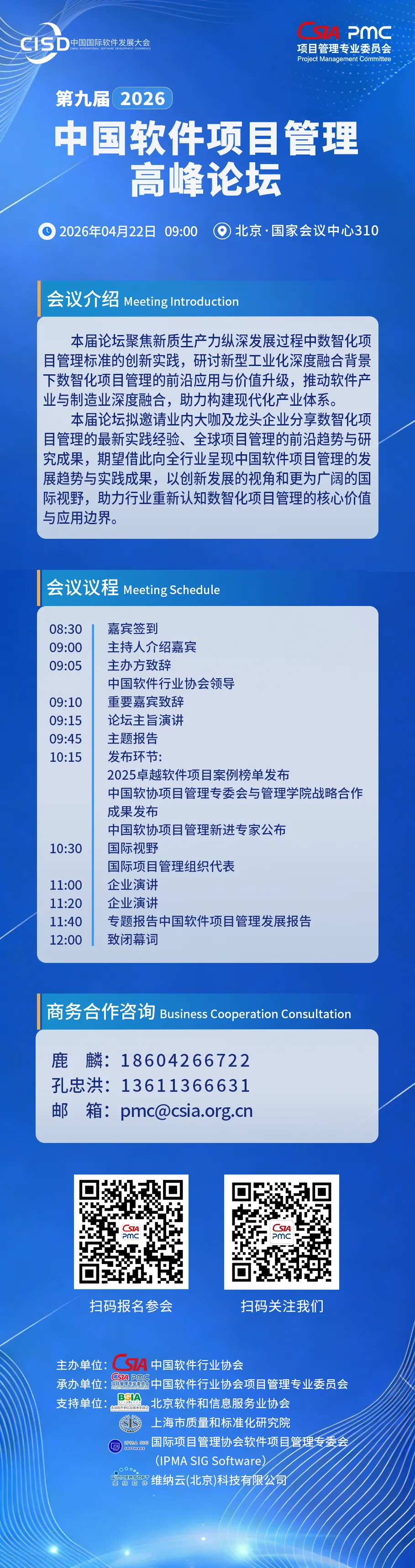 作为年度重磅活动,第九届(2026)中国软件项目管理高峰论坛 定于4月22日在北京国家会议中心隆重举行(见图10)。本届论坛将广邀行业顶尖专家与领军企业代表,深度分享数智化时代项目管理的最新实践与前沿洞察。诚邀业界同仁莅临参会,共襄盛举,擘画未来。参会报名请登录中国软件项目管理平台,或关注专委会微信公众号报名参会。