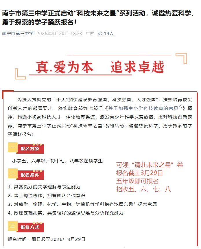 昨天,南宁三中刚发布「科技未来之星」选拔活动出来,马上就被我们家长信息刷屏了!