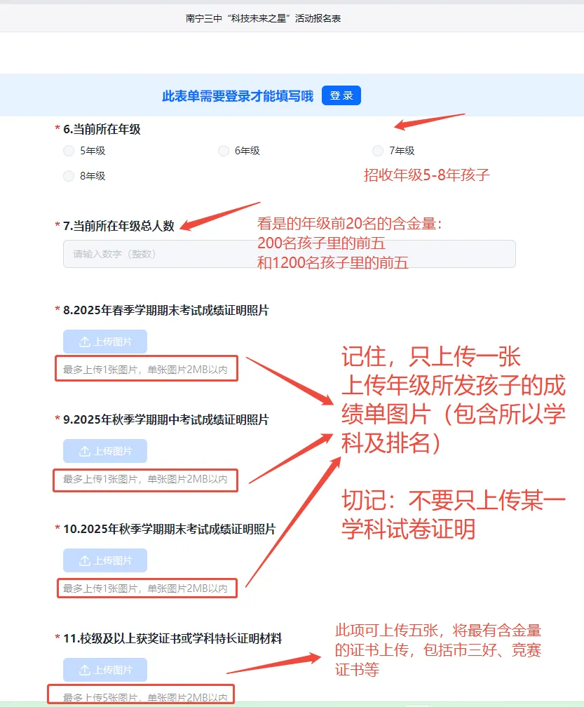 表单要求填写「年级总人数」,本质是看孩子在同年级的相对位次——200人里的前 5,和1200 人里的前5,含金量完全不同,年级前 5%-10% 更有竞争力。